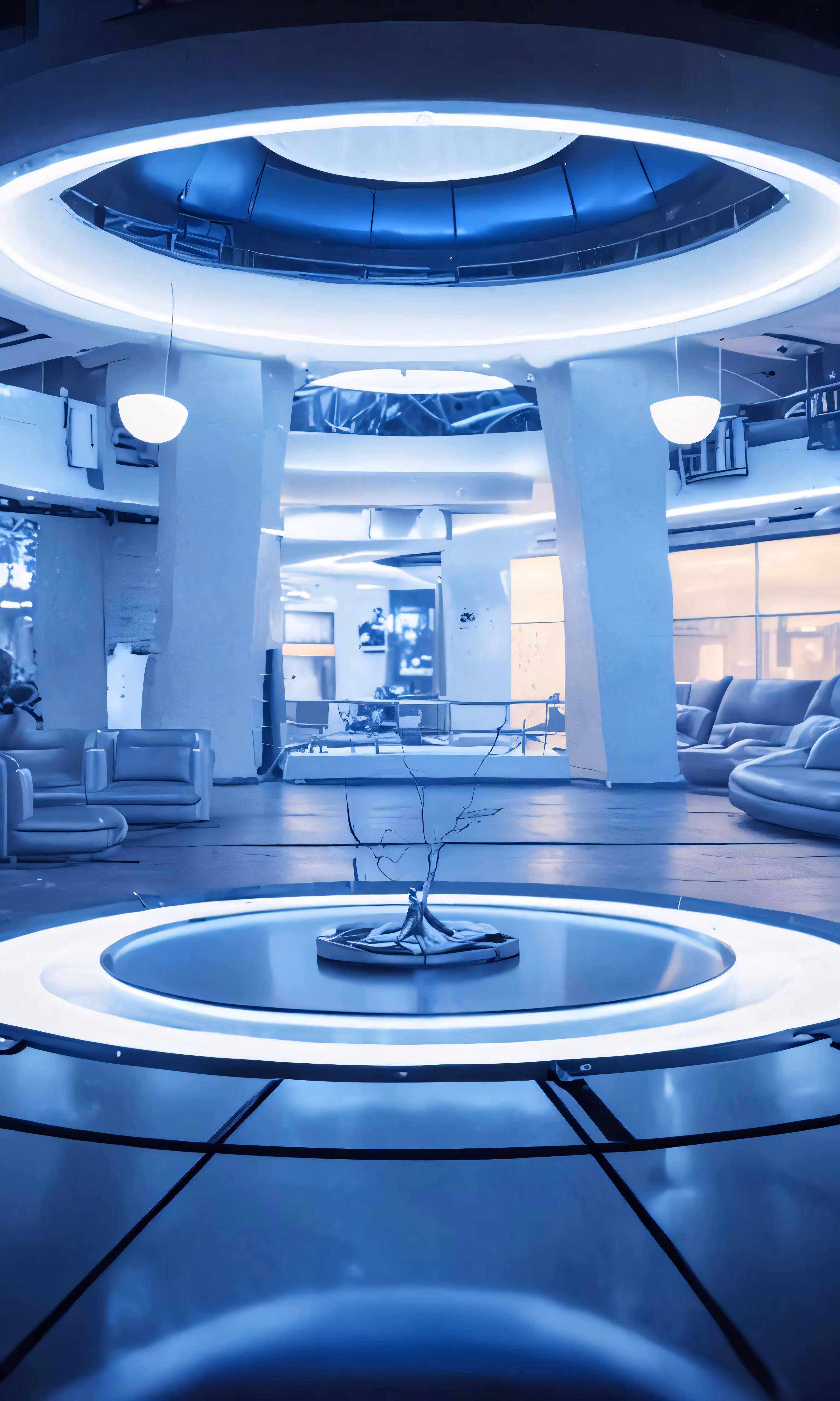 High resolution picture, free to use, a futuristic room with two large circular tables