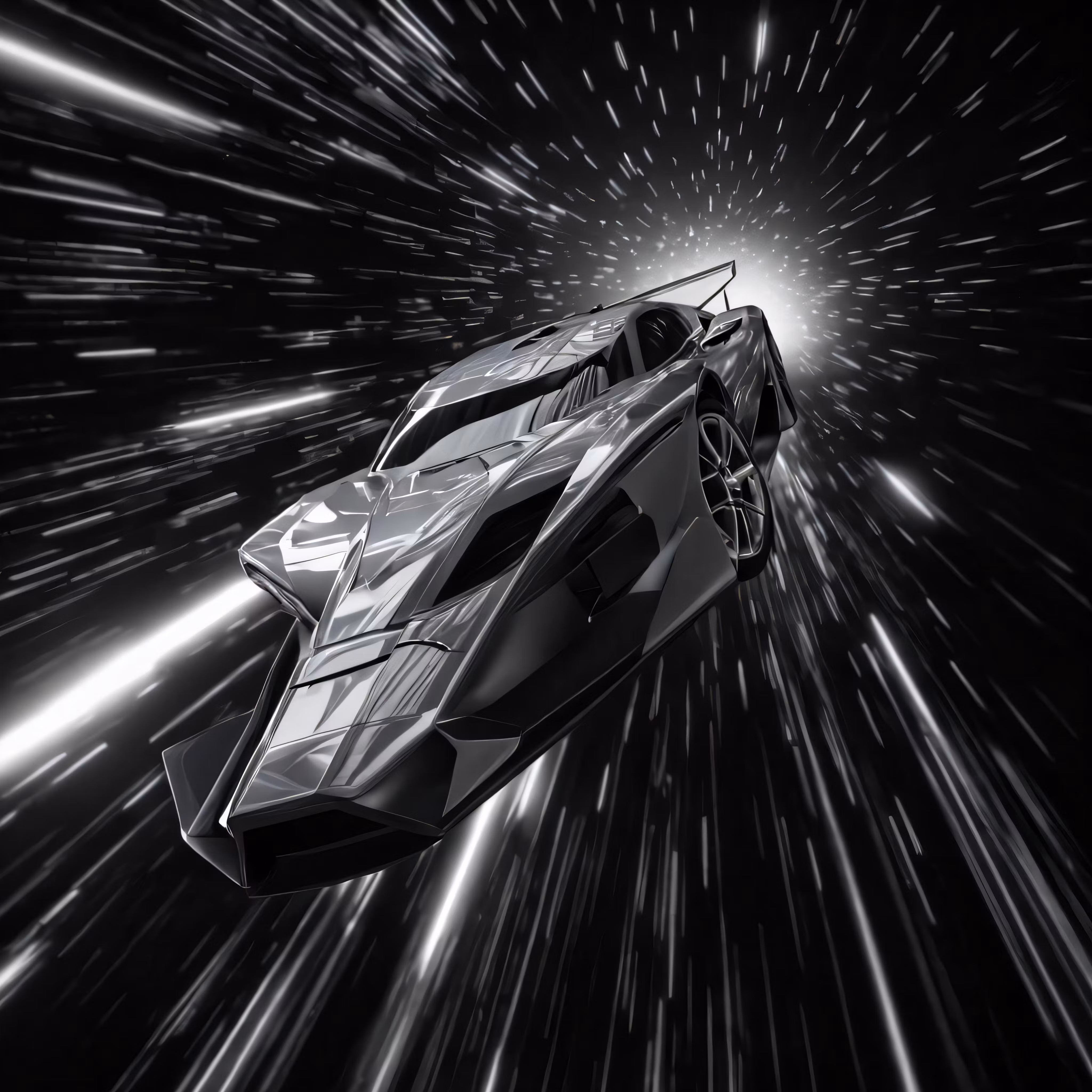 High resolution picture, free to use, a futuristic supercar flying through space with stars around