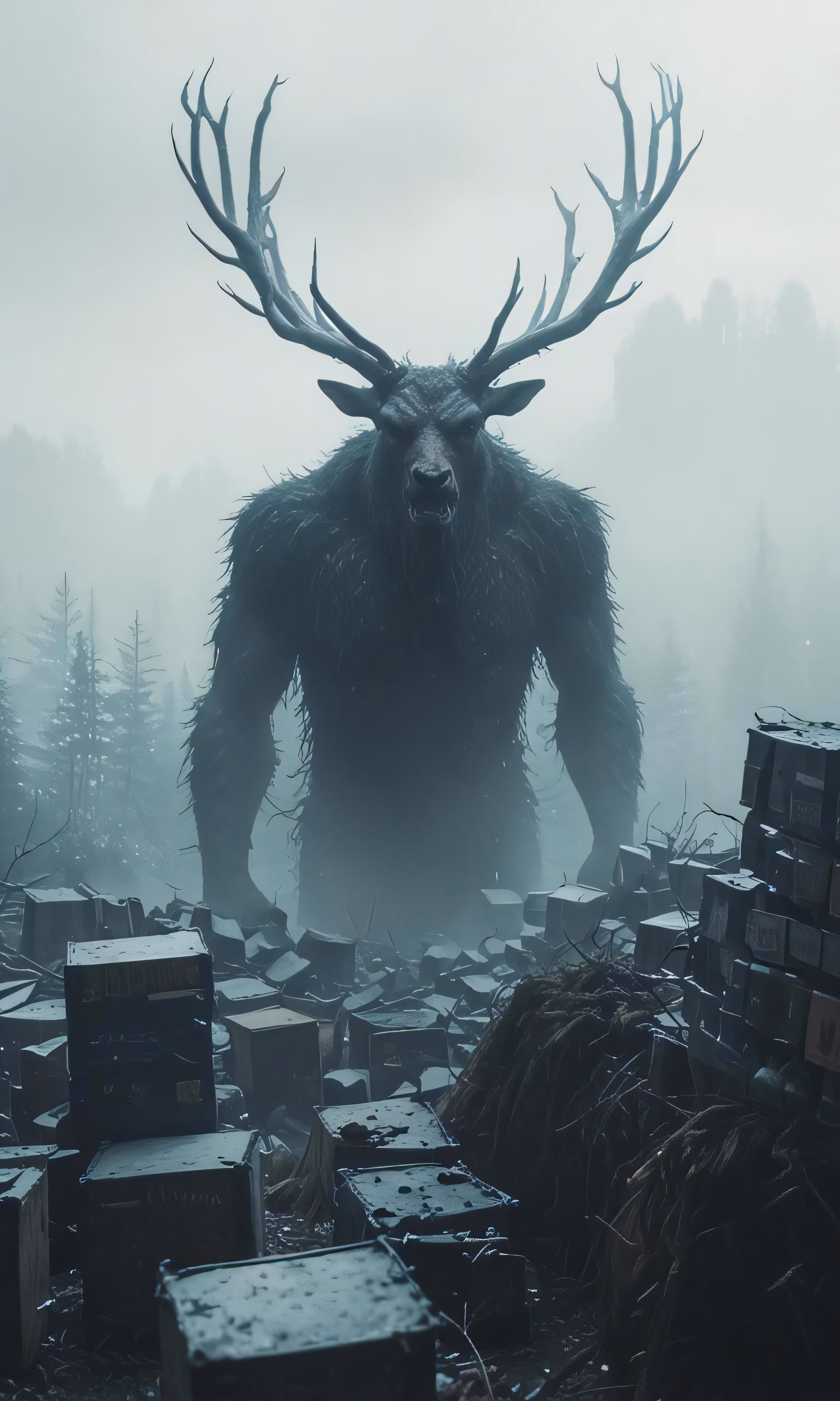 High resolution picture, free to use, a giant black monster surrounded by boxes and trees