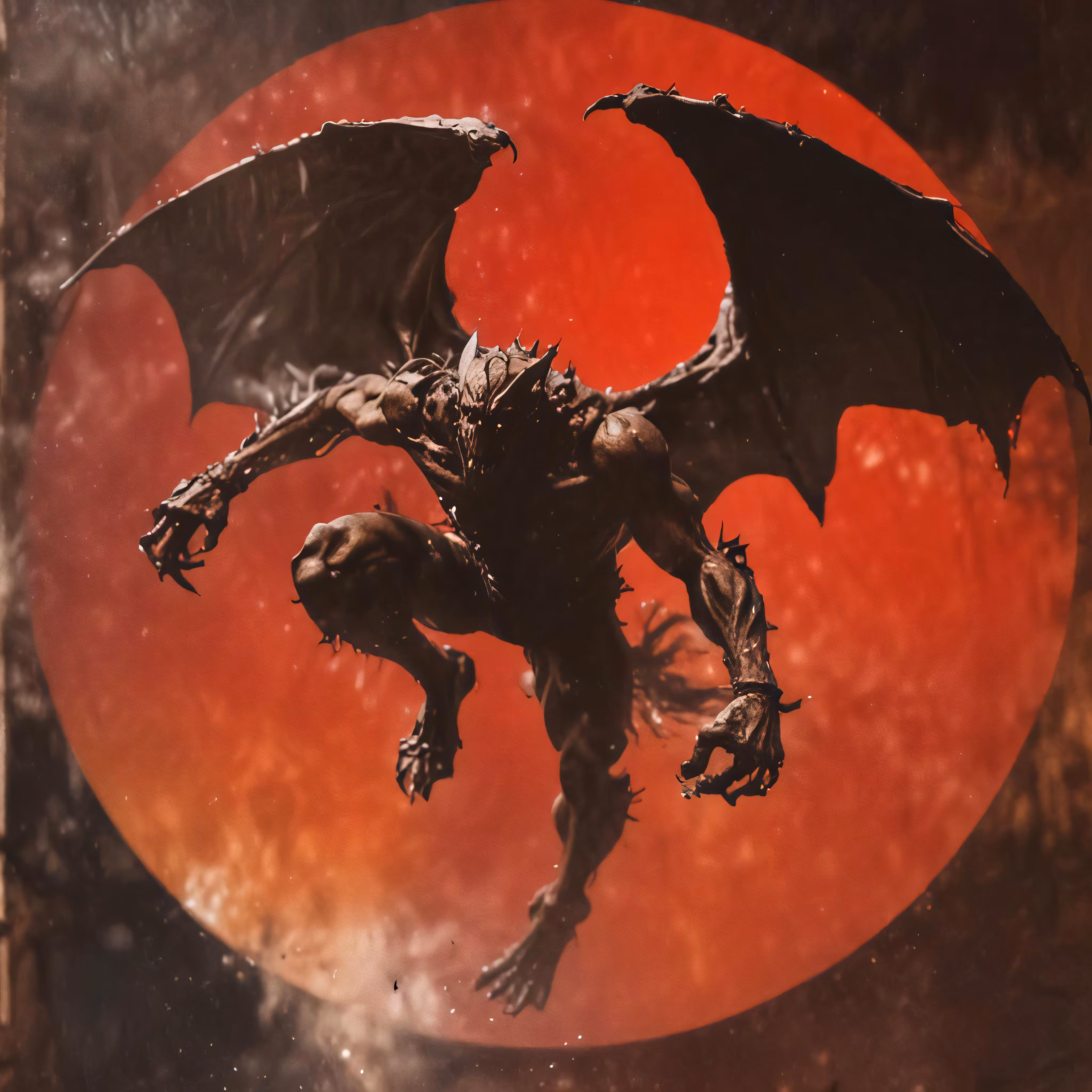 High resolution picture, free to use, a giant demonic creature with massive wings in front of a round red sun