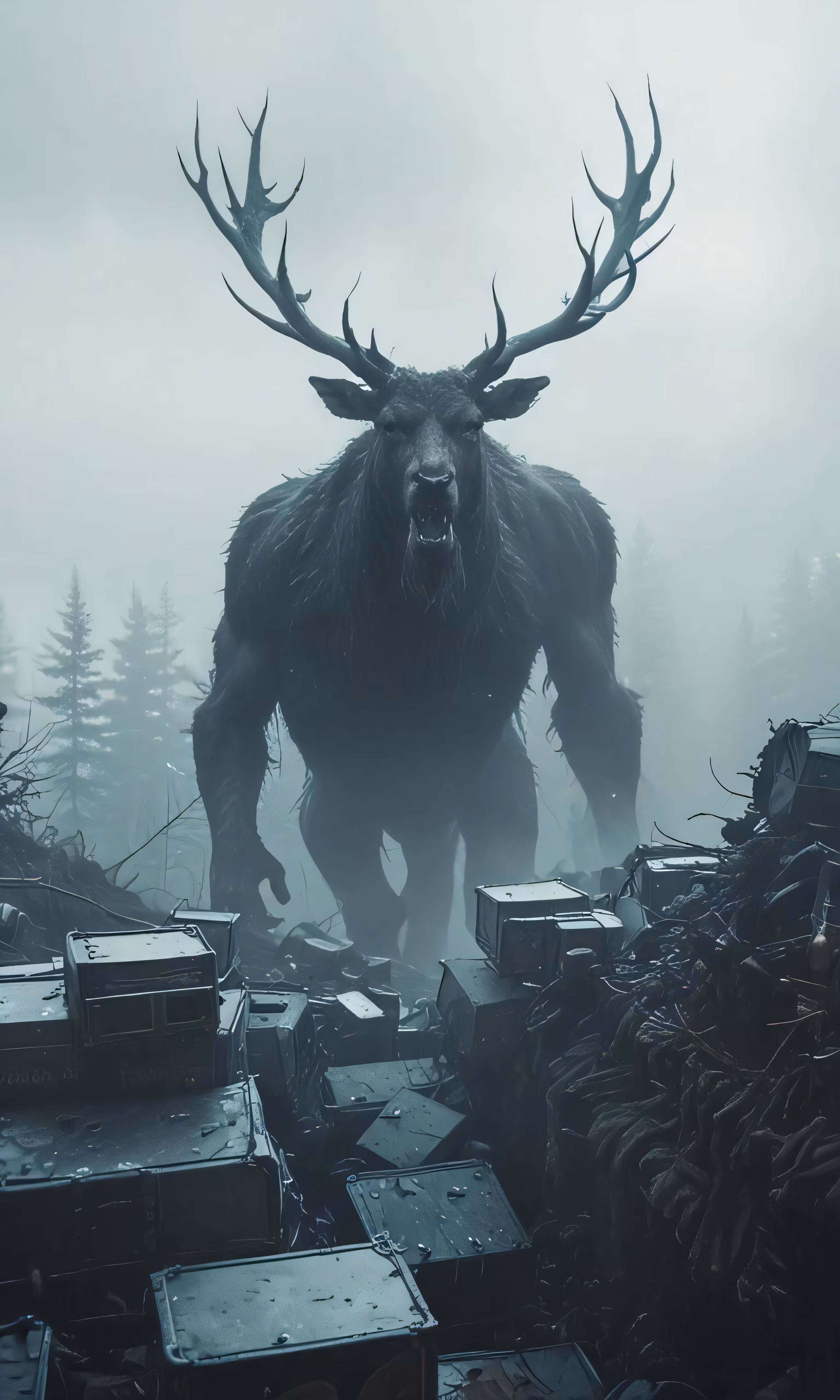 High resolution picture, free to use, a giant elk standing next to many chestes with their huge antlers