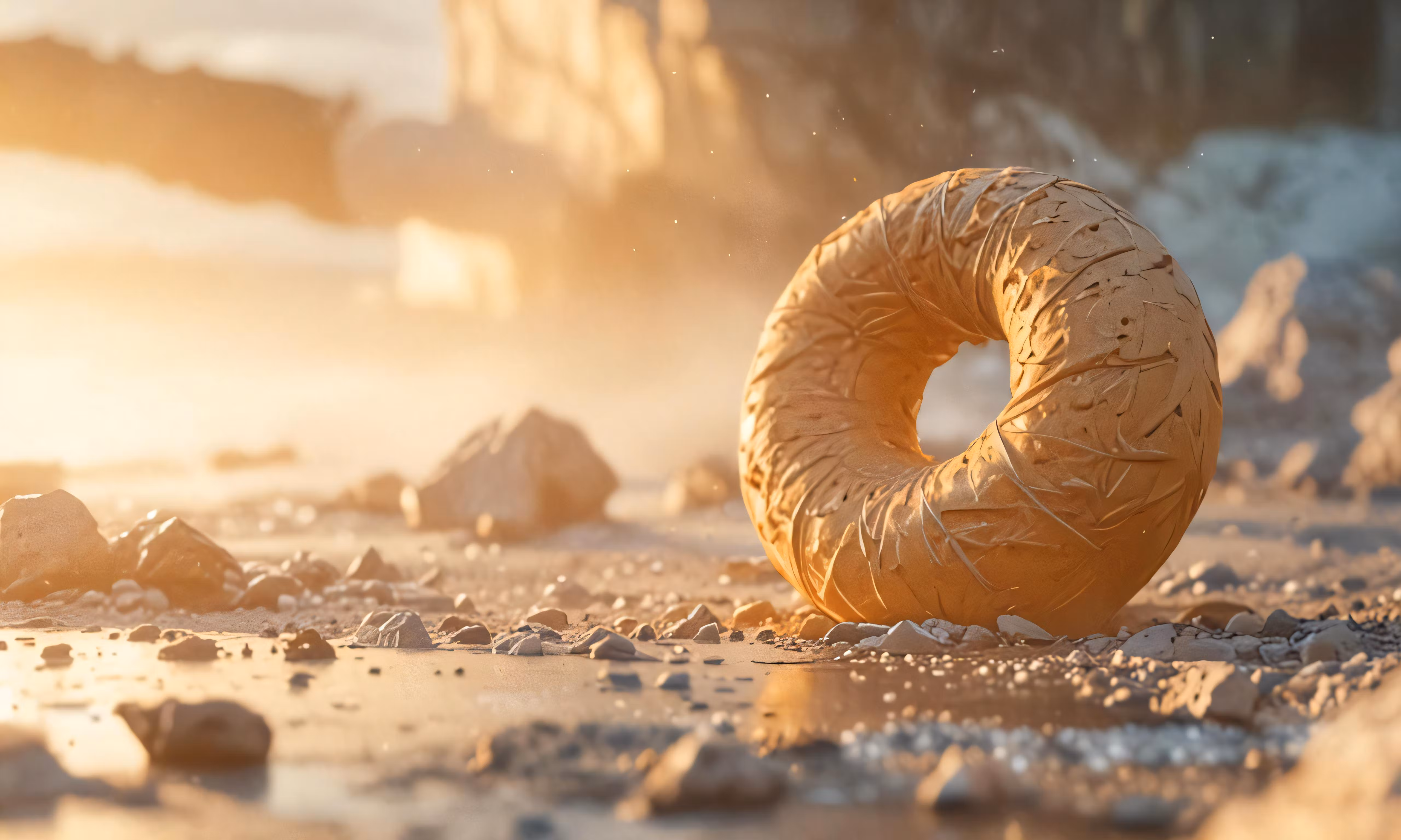 High resolution picture, free to use, a giant plastic donut sitting on some rocks
