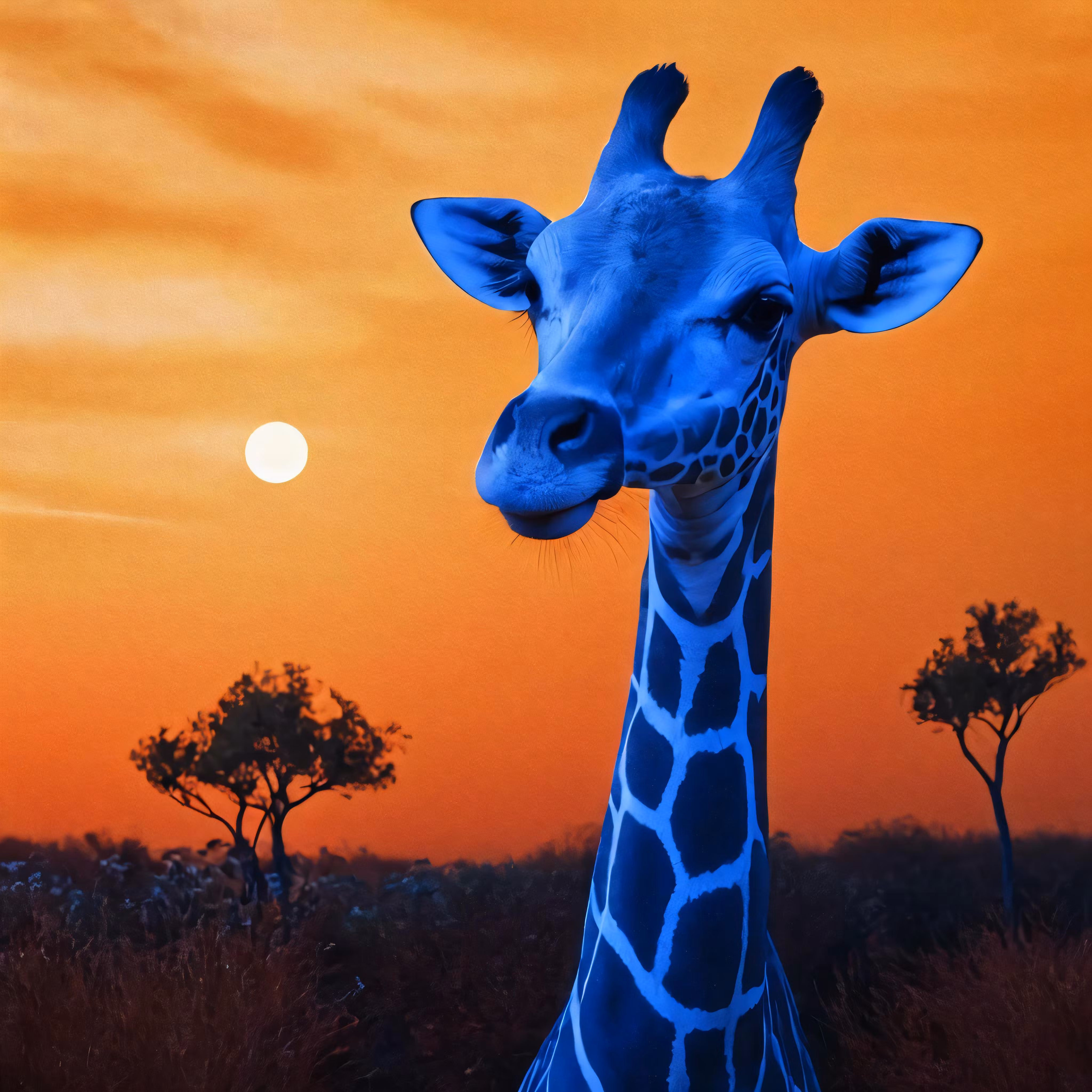 High resolution picture, free to use, a giraffe is looking into the camera at sunset