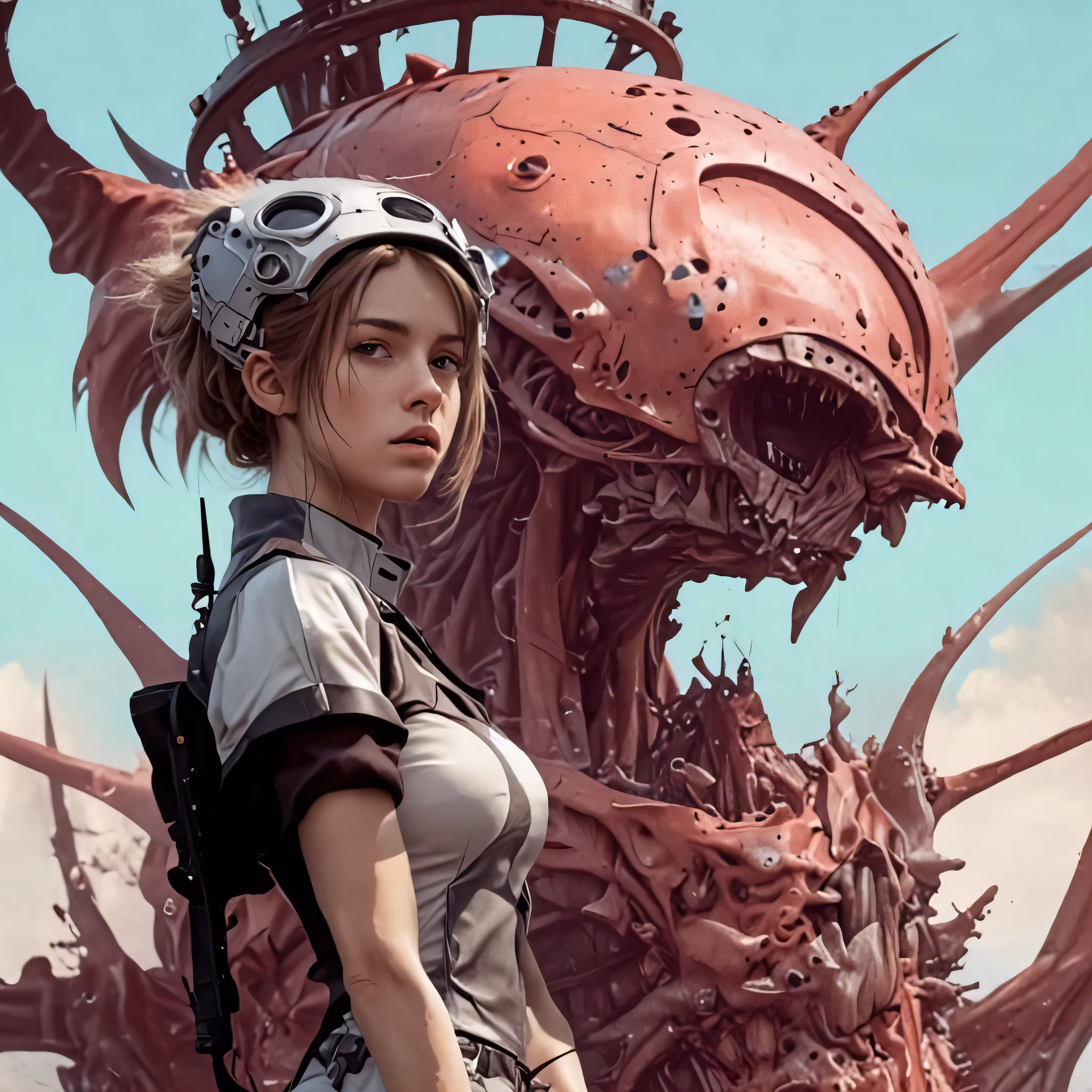 High resolution picture, free to use, a girl and an alien standing next to each other in front of some huge statues