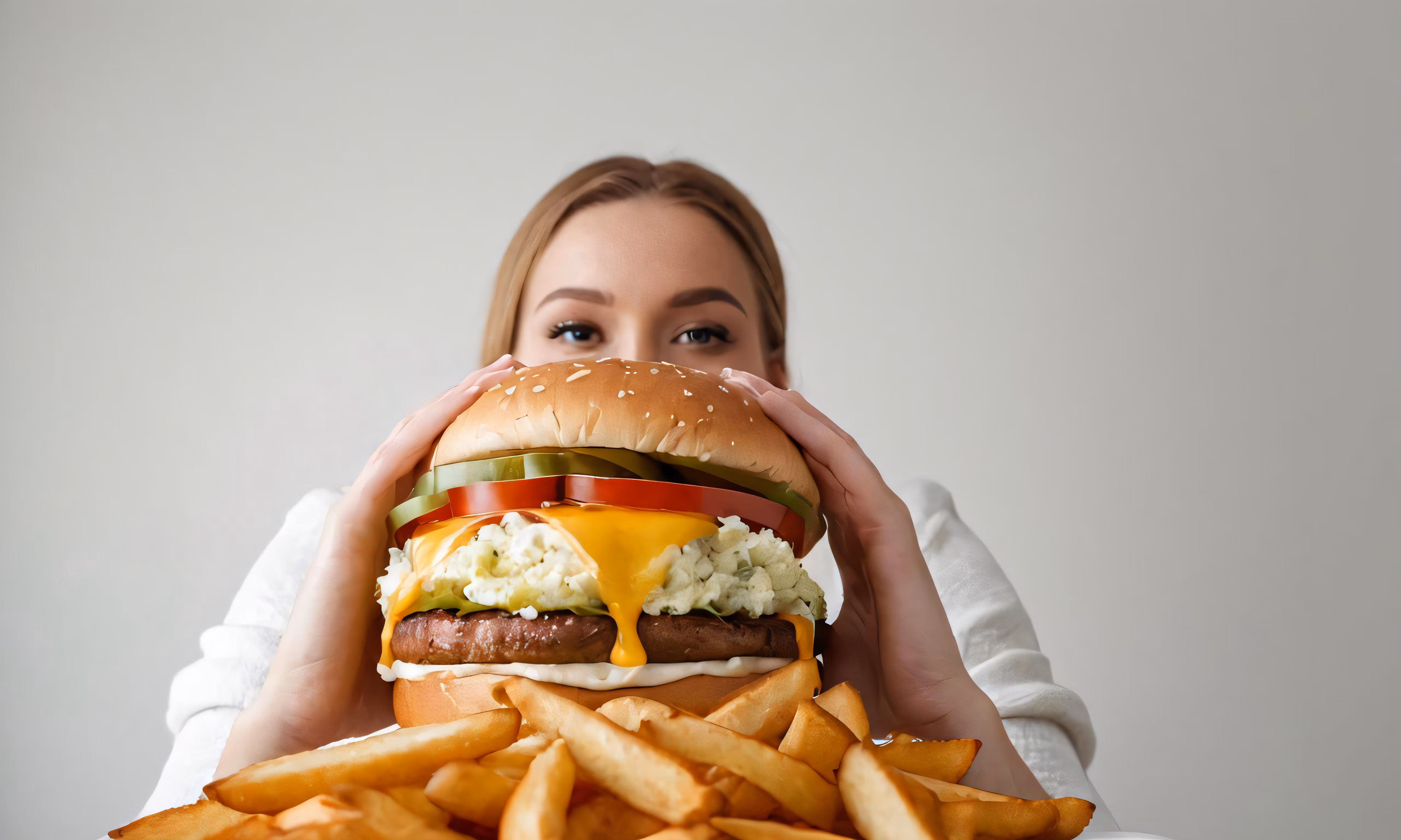 High resolution picture, free to use, a girl holding a hamburger in front of her face with fries
