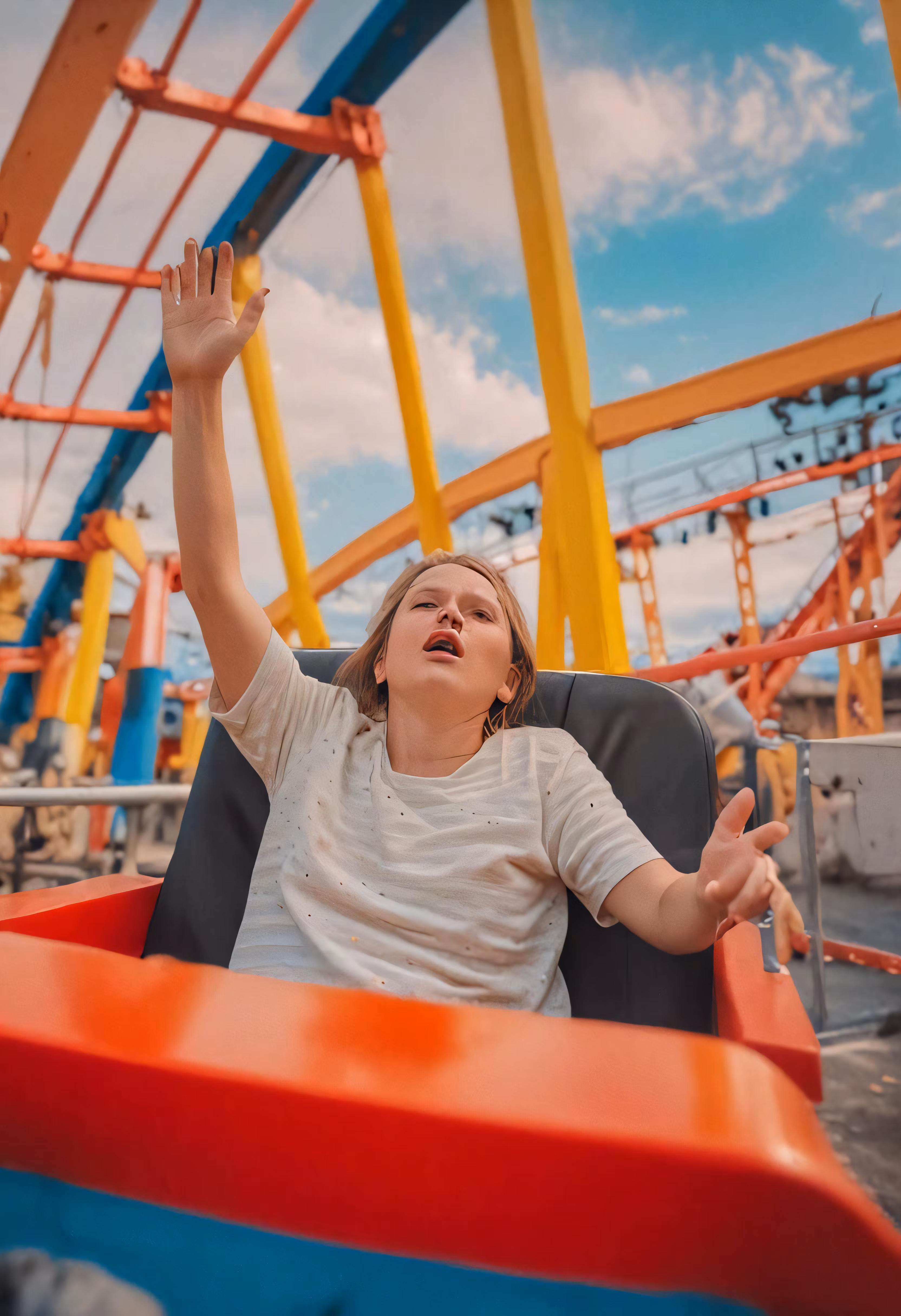 High resolution picture, free to use, a girl holding up her hands while riding a roller coaster
