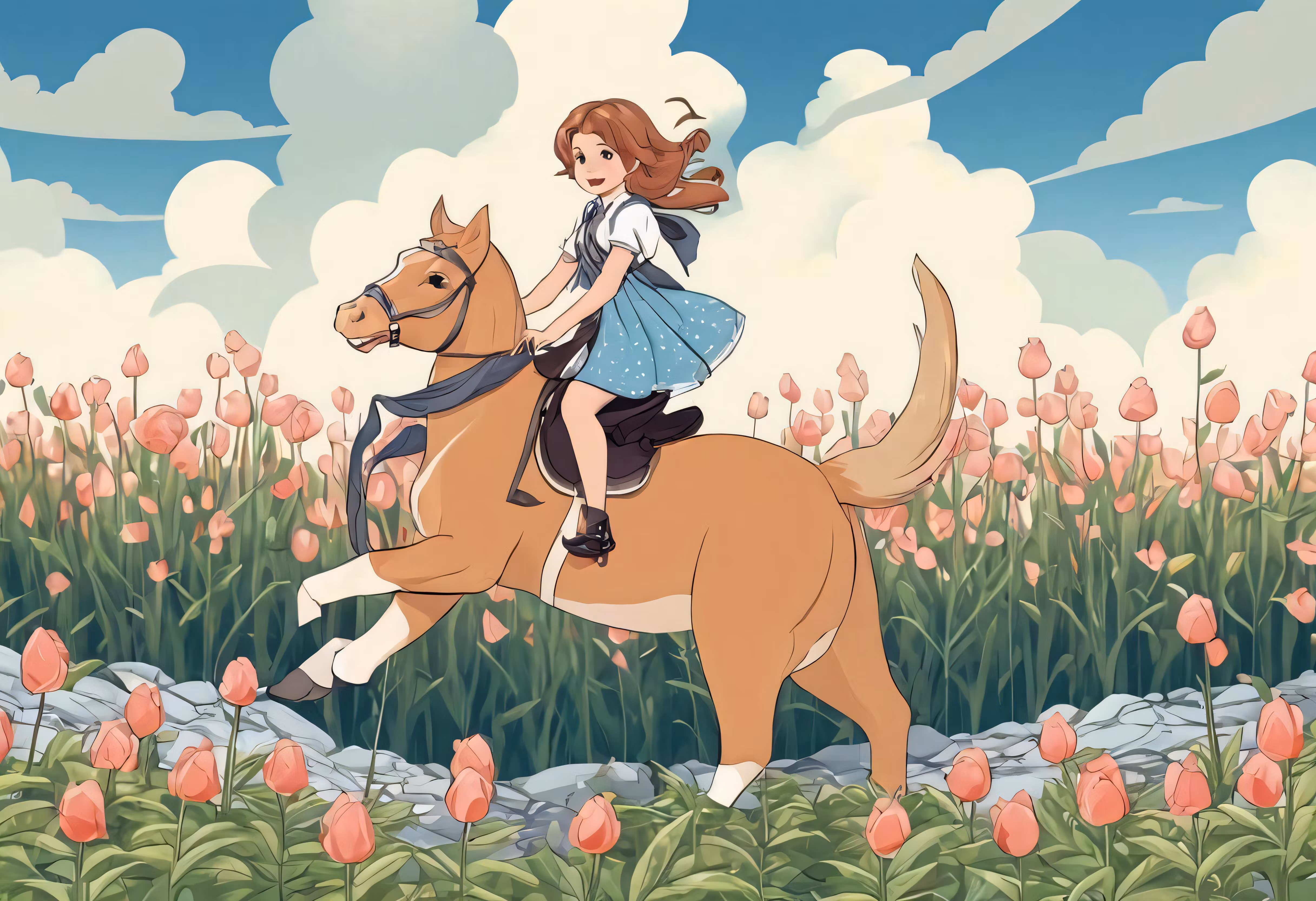 High resolution picture, free to use, a girl in a dress riding on a brown horse
