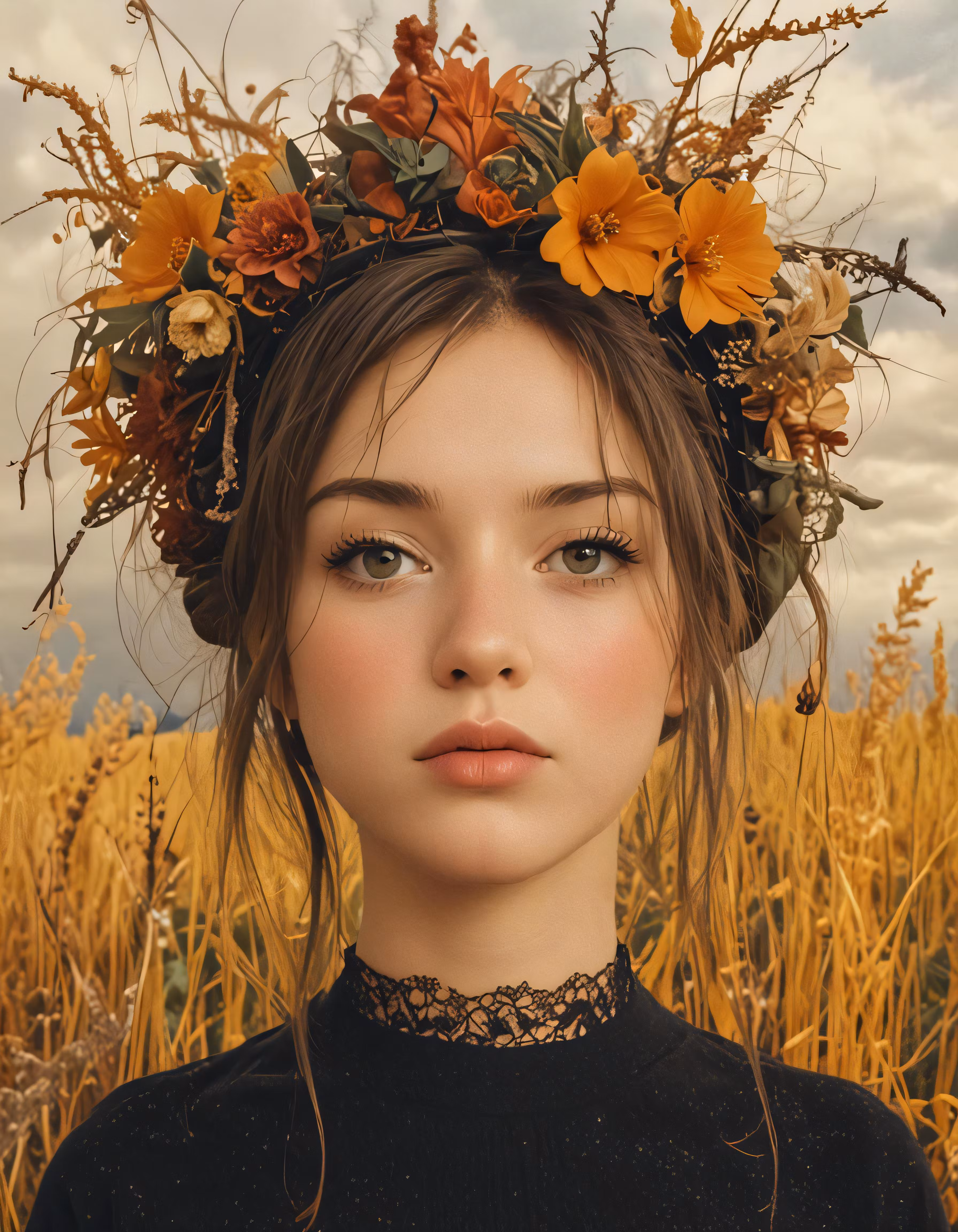 High resolution picture, free to use, a girl in a field wearing a flower crown