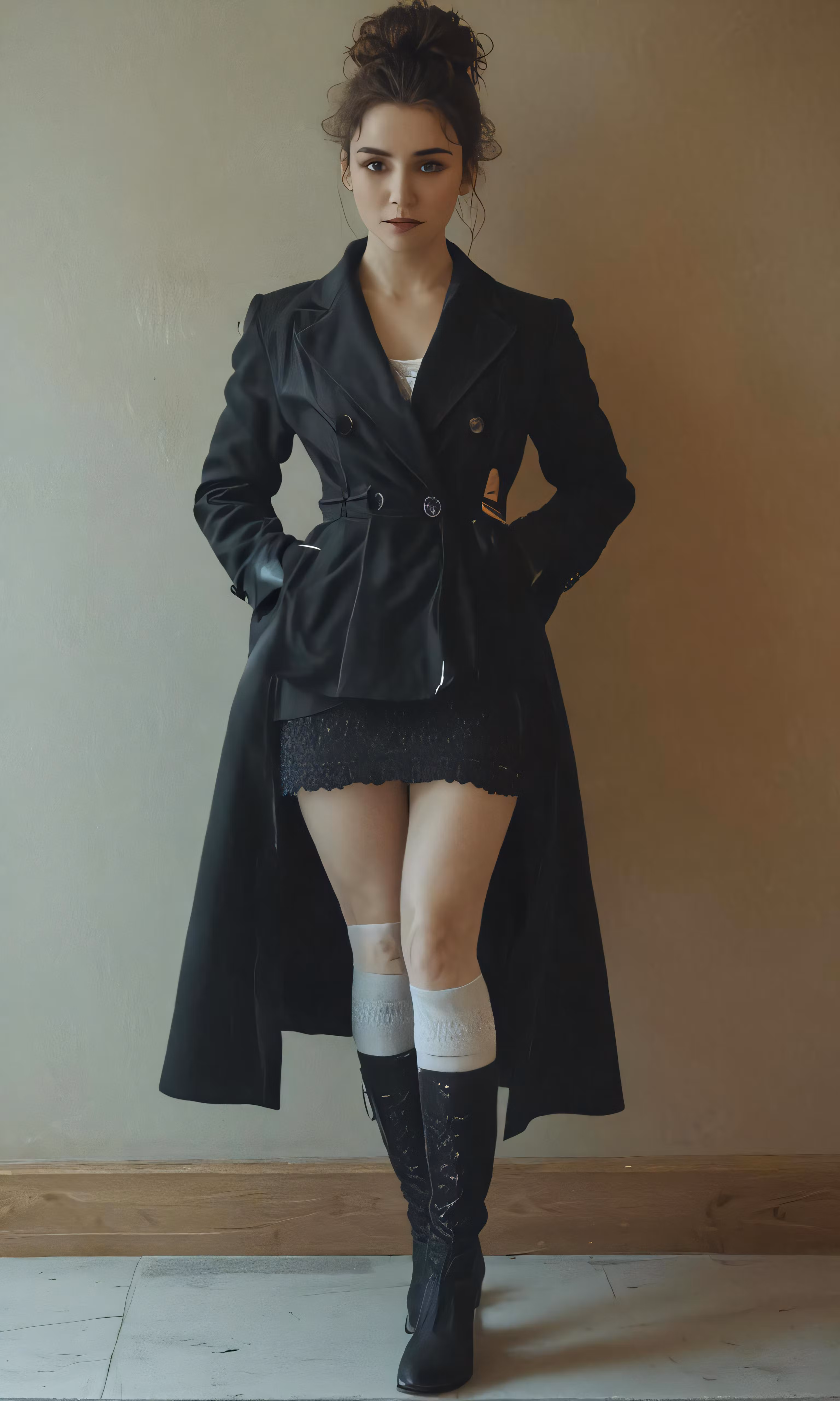 High resolution picture, free to use, a girl in a long black coat and white socks