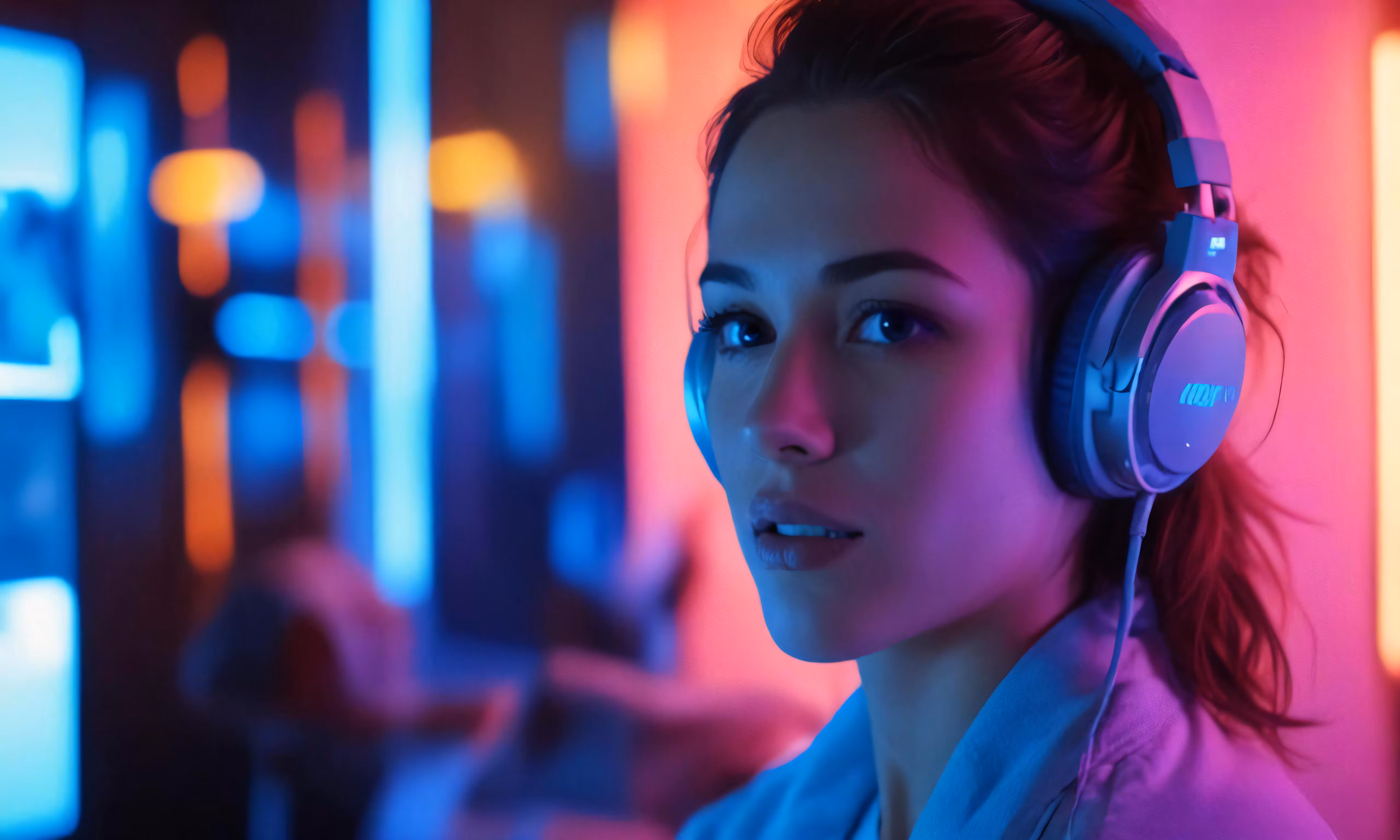 High resolution picture, free to use, a girl in a neon colored room wearing headphones