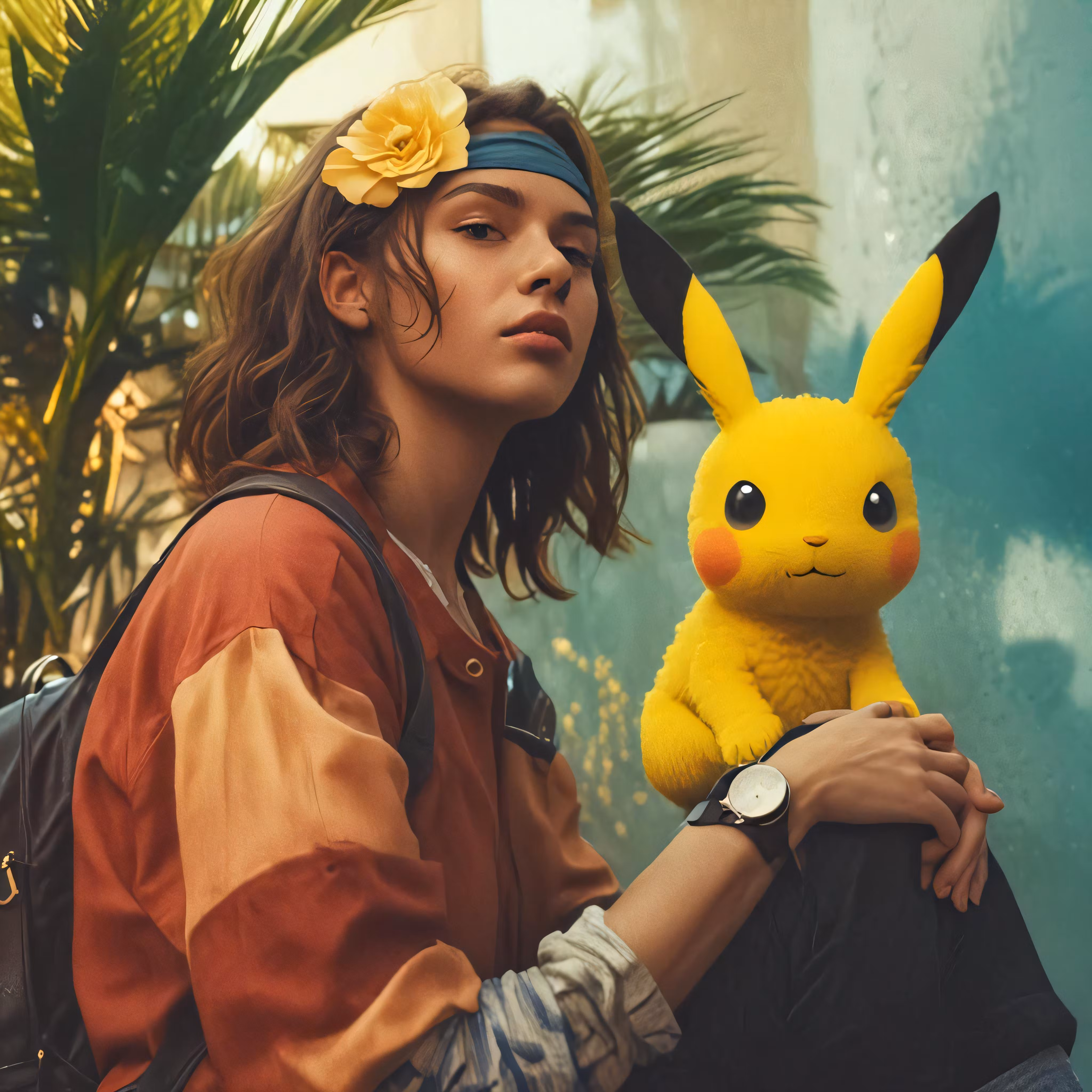 High resolution picture, free to use, a girl in a pokemon outfit sitting down holding a toy