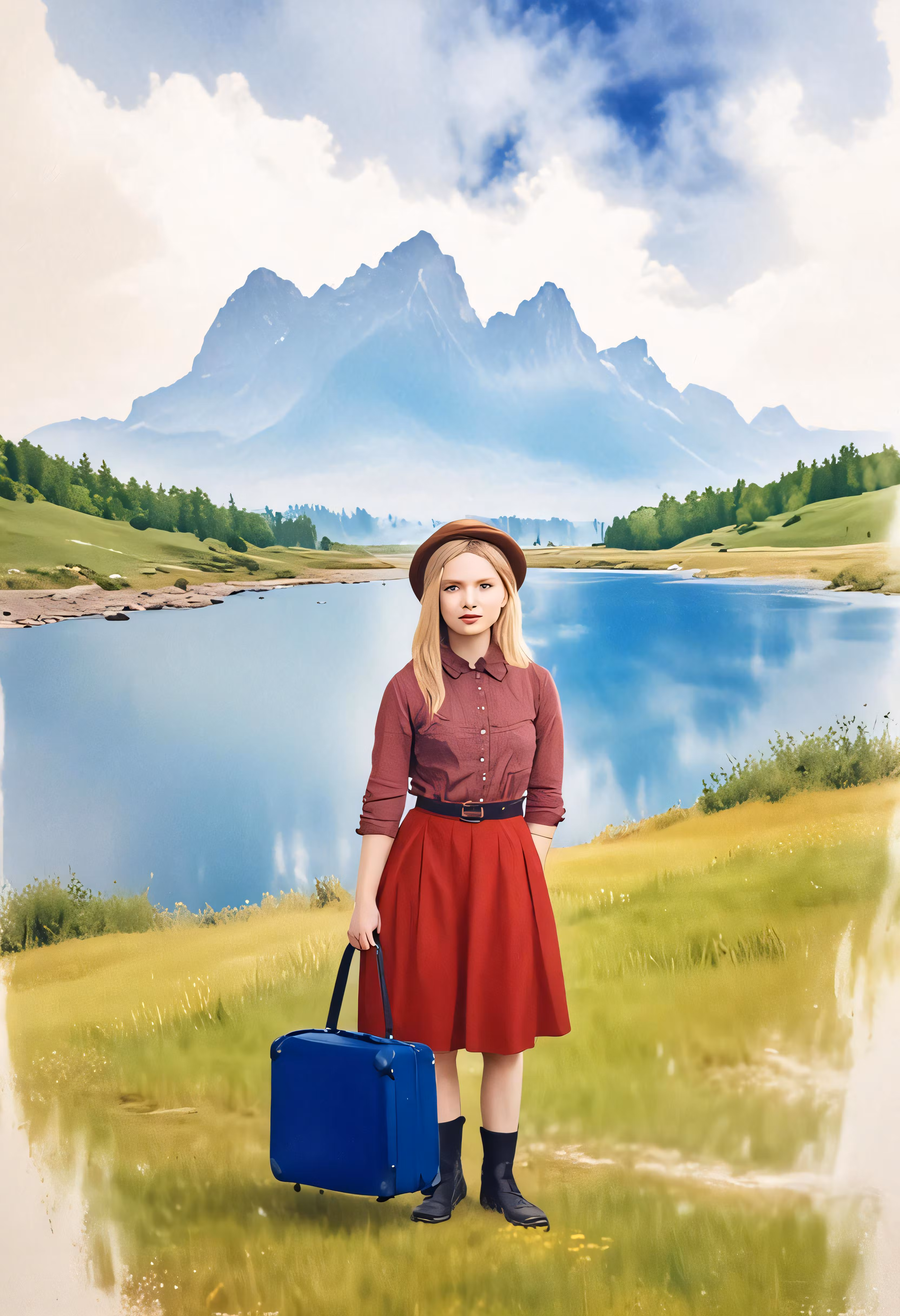 High resolution picture, free to use, a girl in a red dress and hat with blue luggage