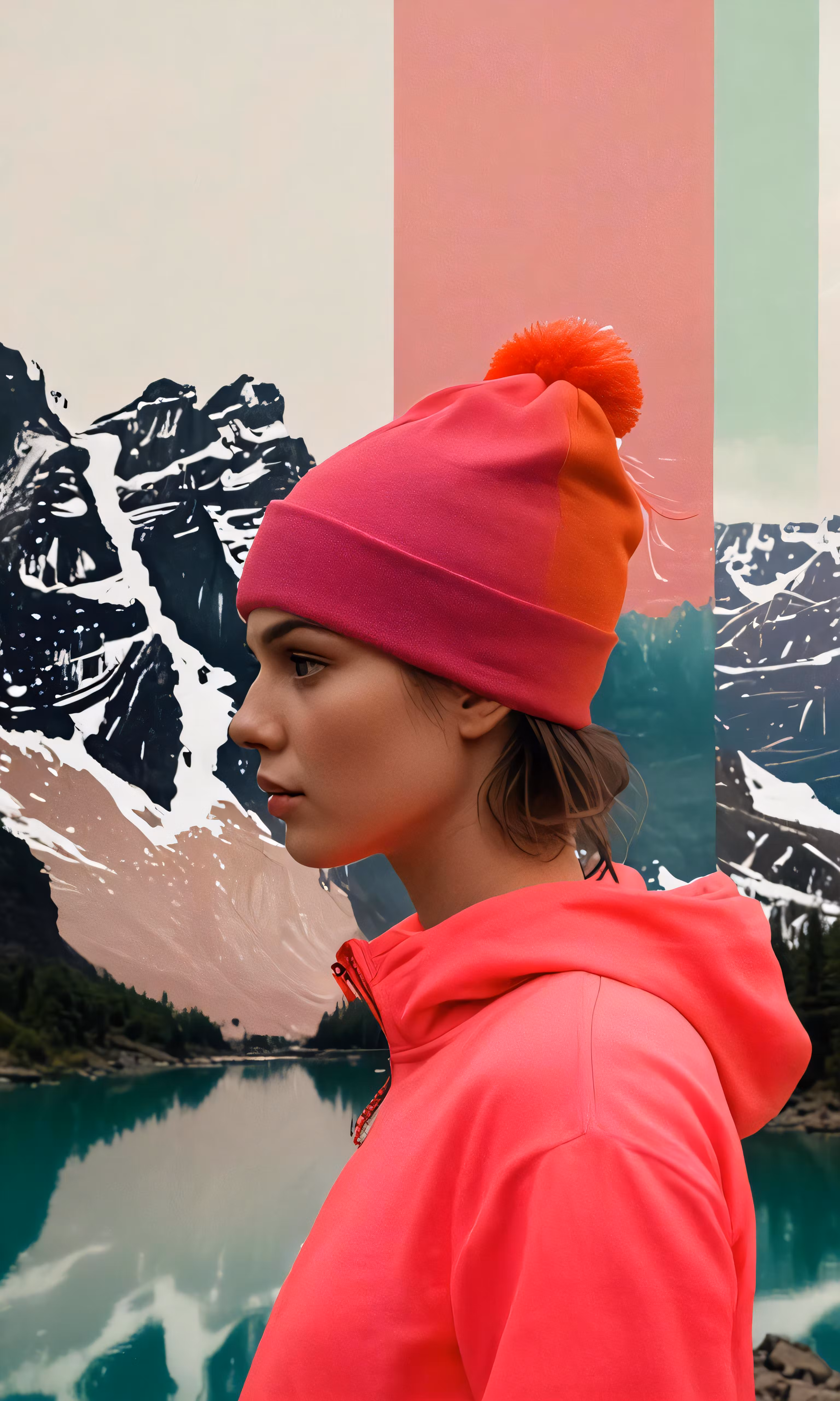 High resolution picture, free to use, a girl in a red hoodie standing by a lake wearing a bright pink coat and a matching beanie