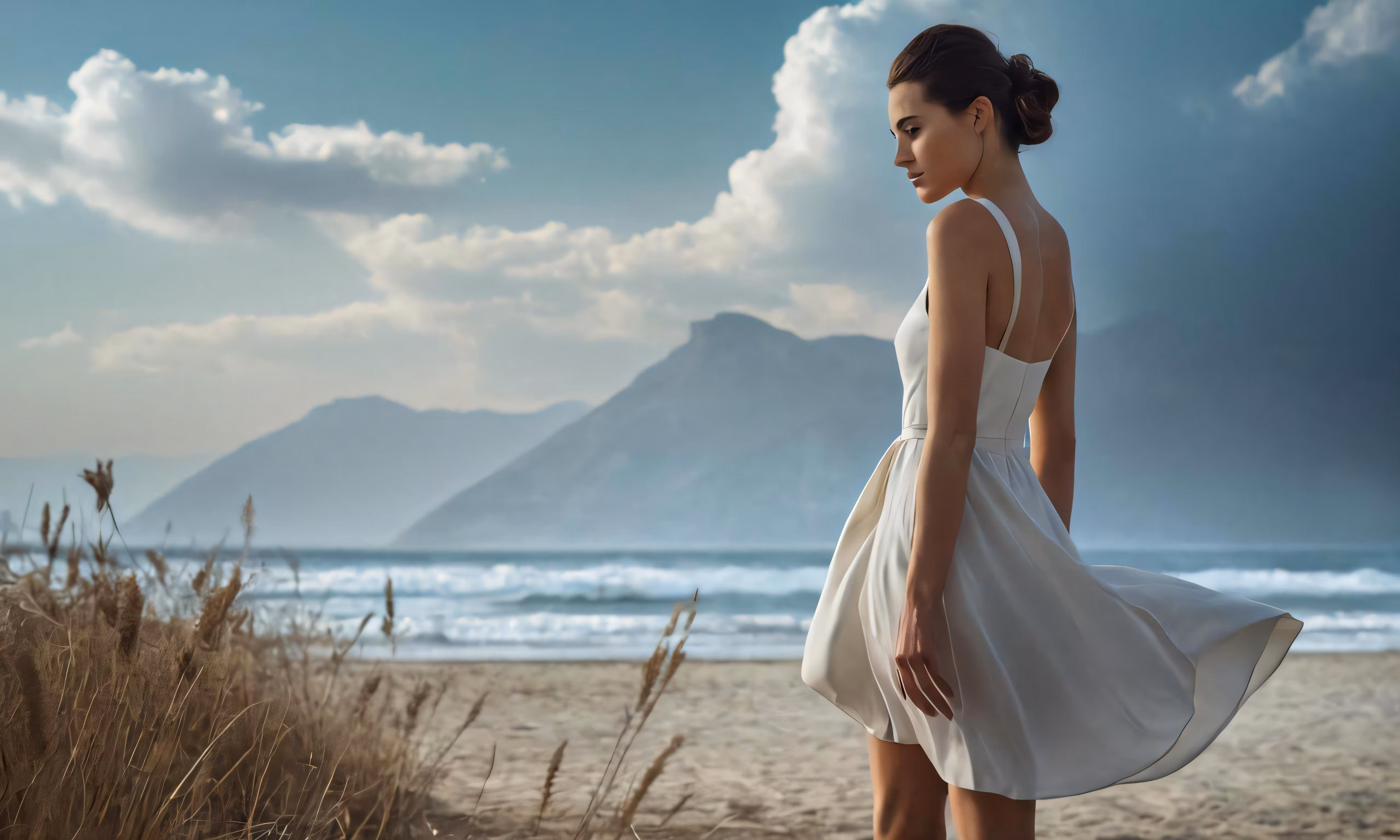 High resolution picture, free to use, a girl in a short white dress standing on a beach