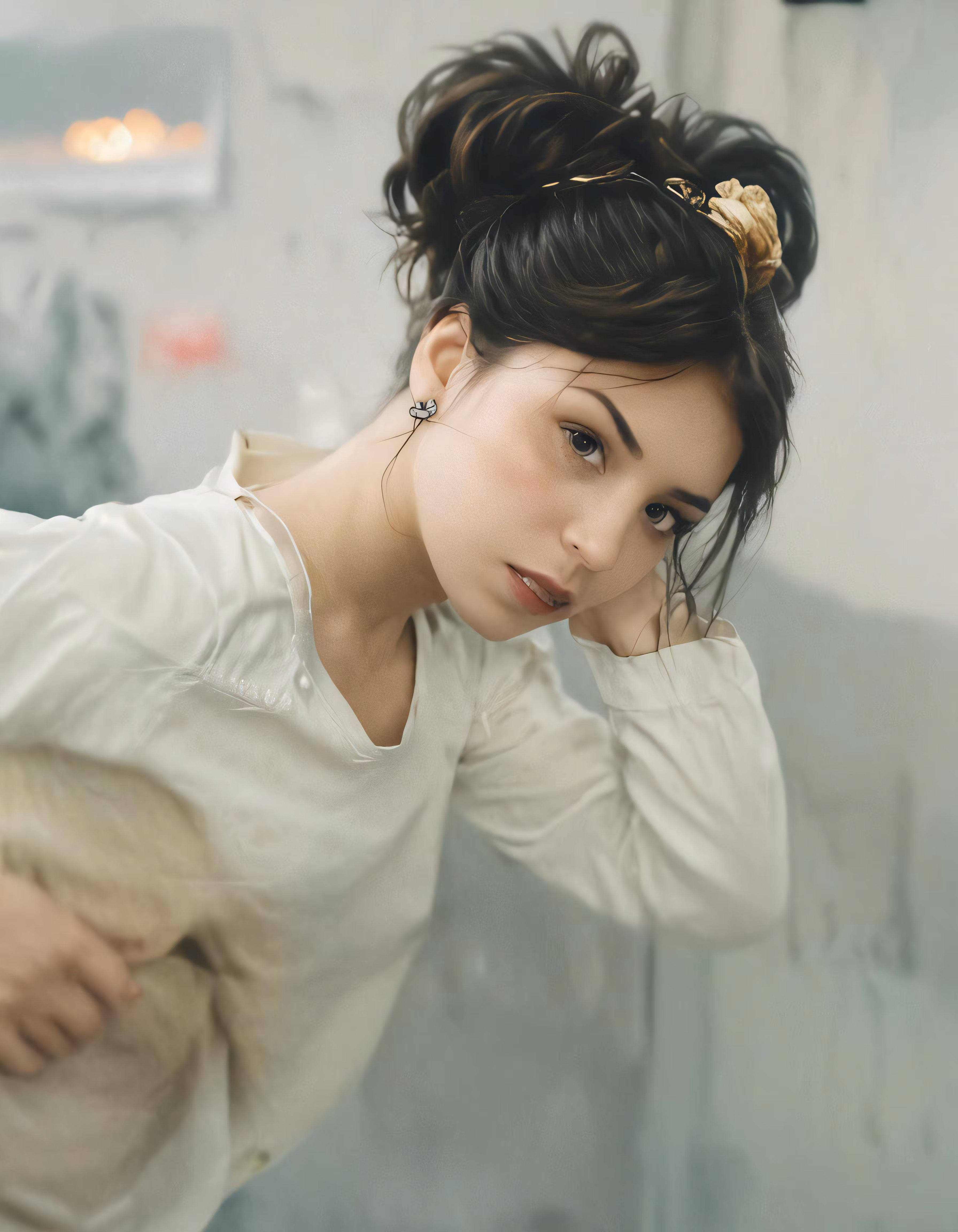 High resolution picture, free to use, a girl in a white blouse leaning on a window