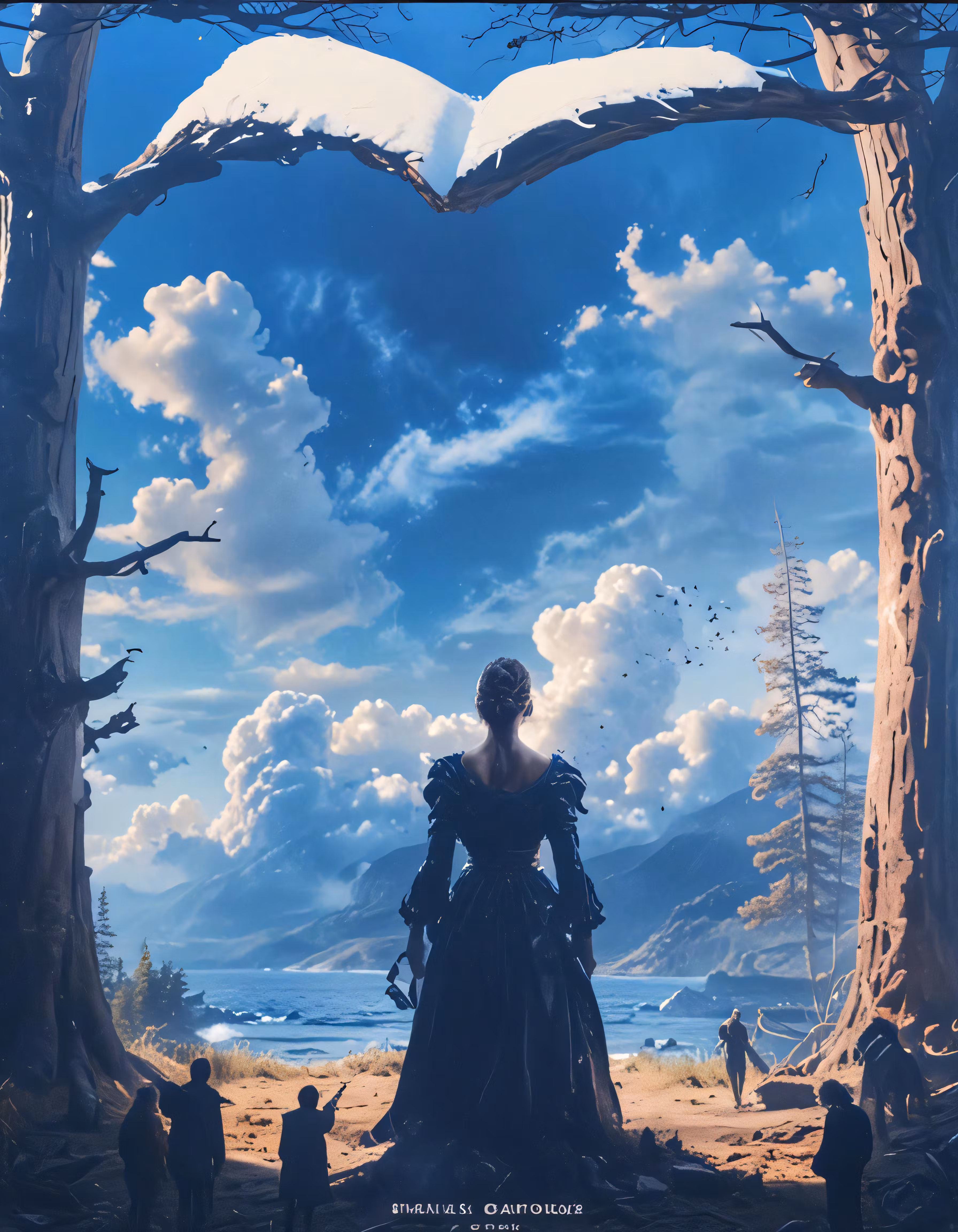 High resolution picture, free to use, a girl in an historical dress stares into a forest while people gather around