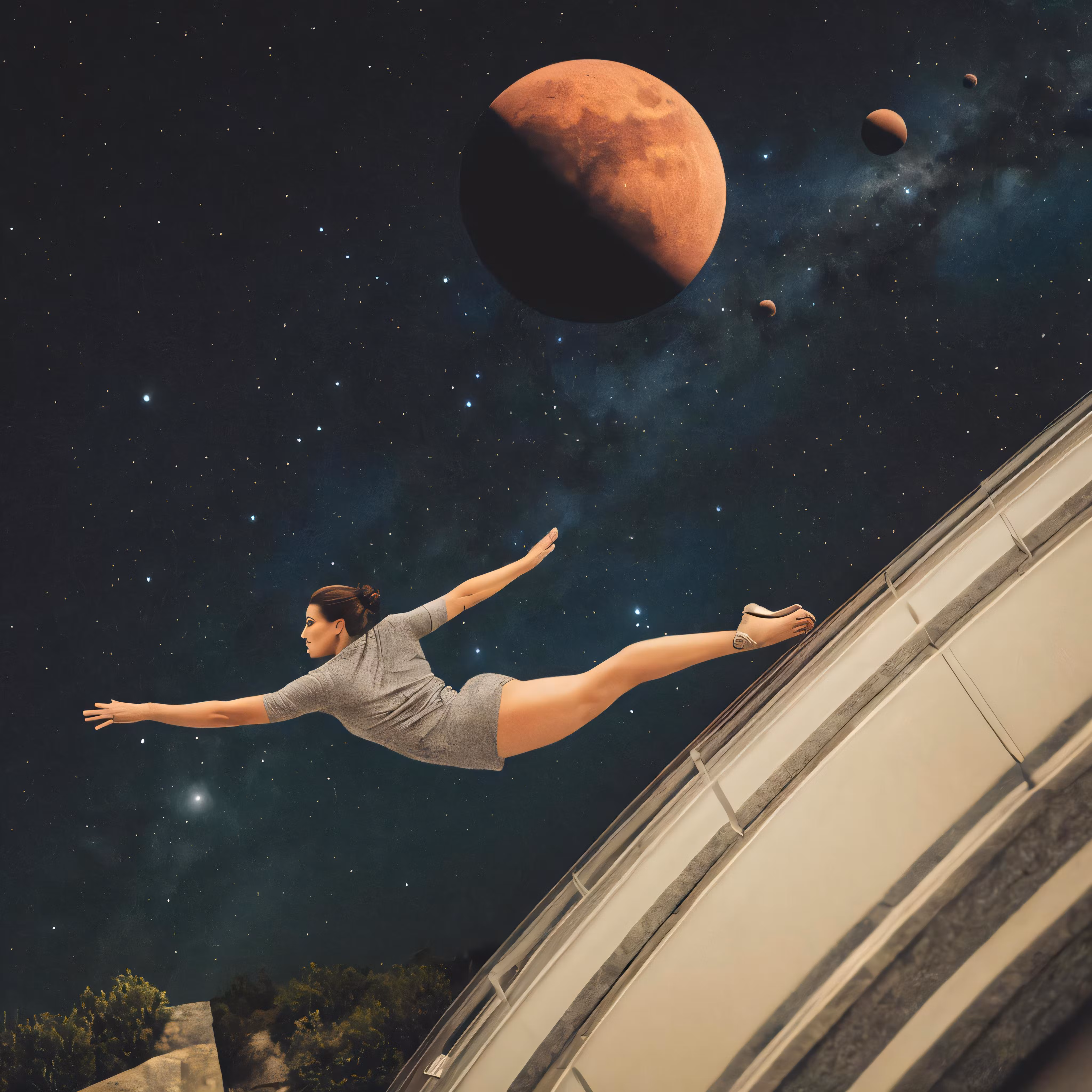 High resolution picture, free to use, a girl in grey shirt flying off a platform near the moon