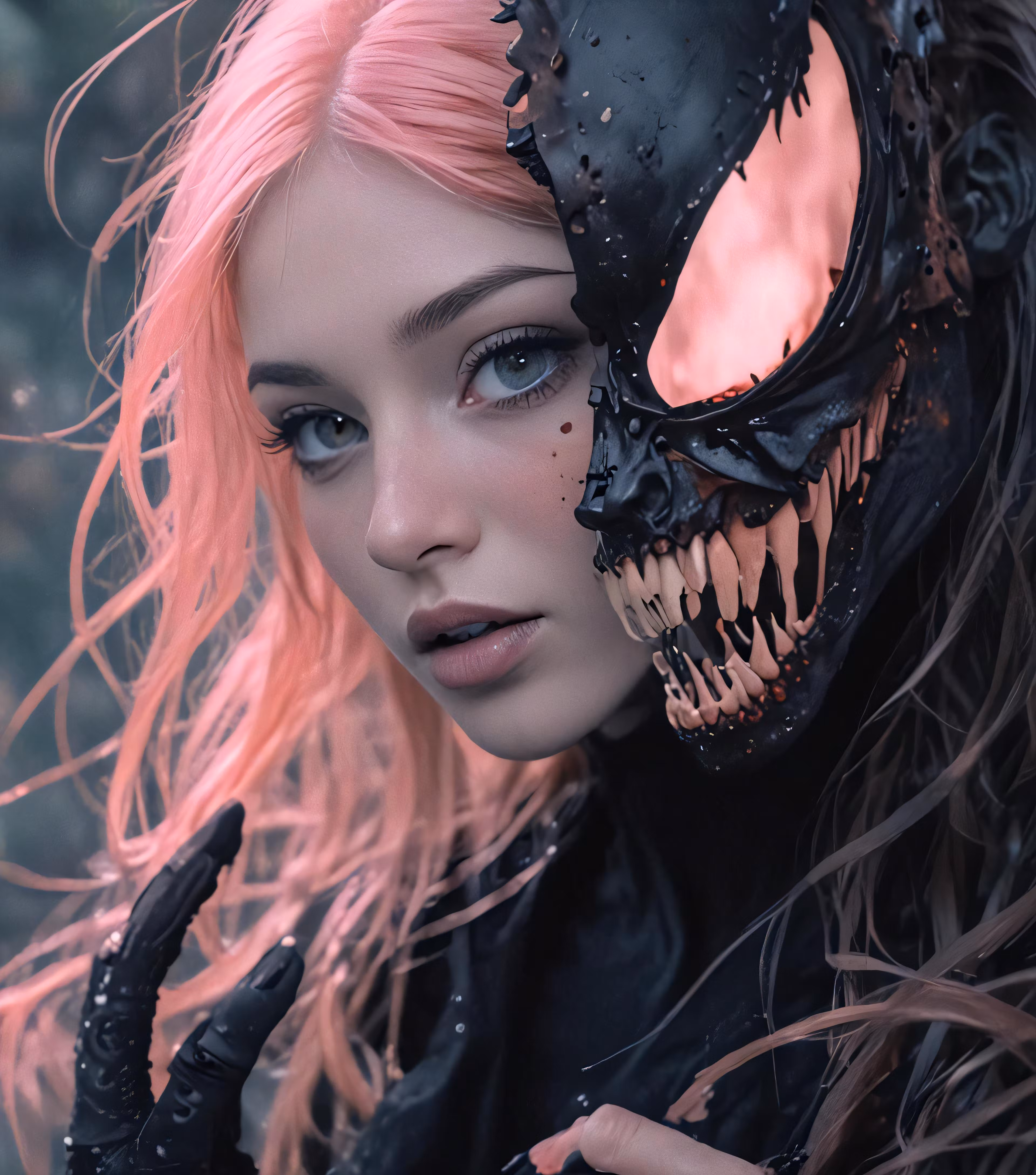 High resolution picture, free to use, a girl is in black with a skull on her head and pink hair