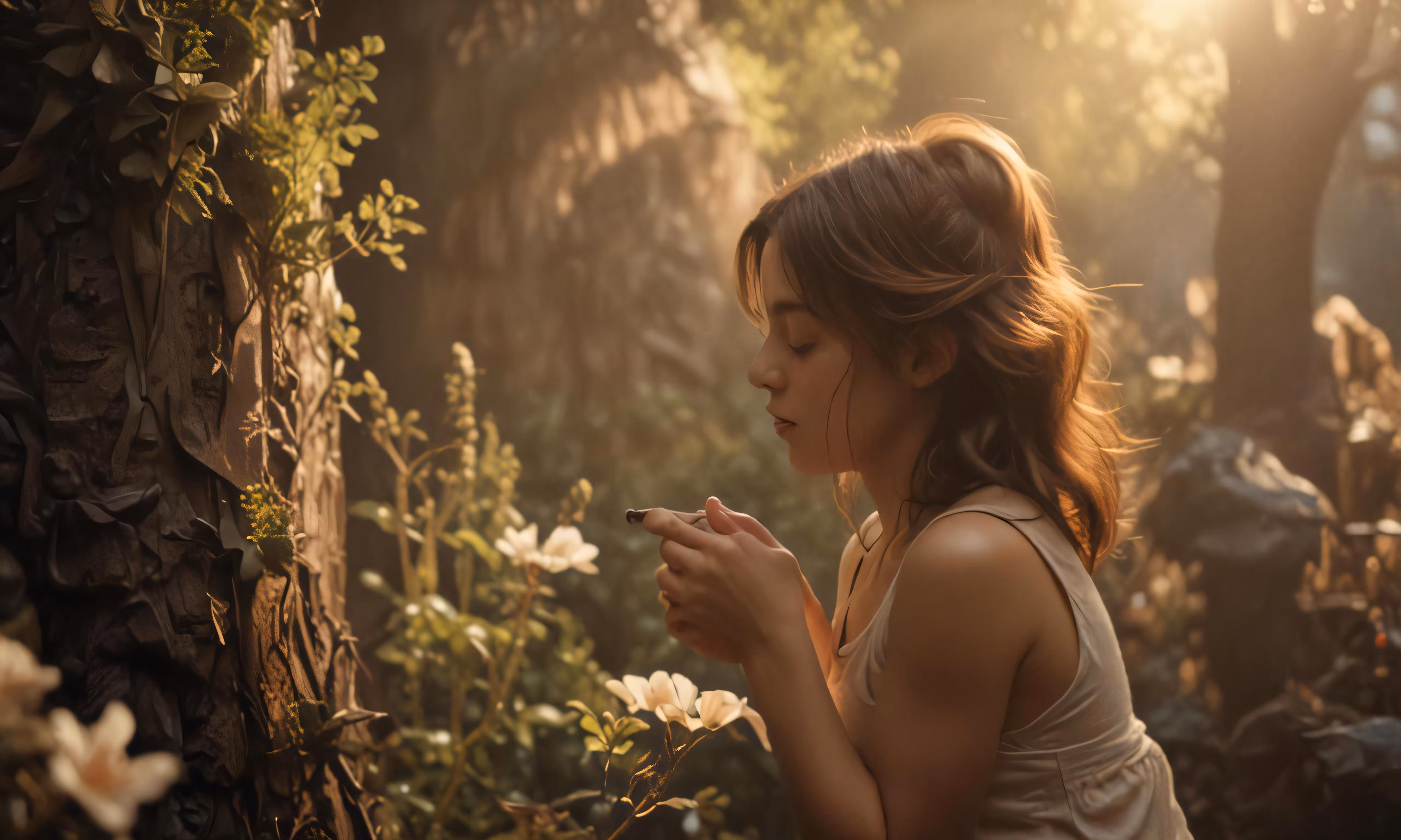 High resolution picture, free to use, a girl is praying on the ground in a forest