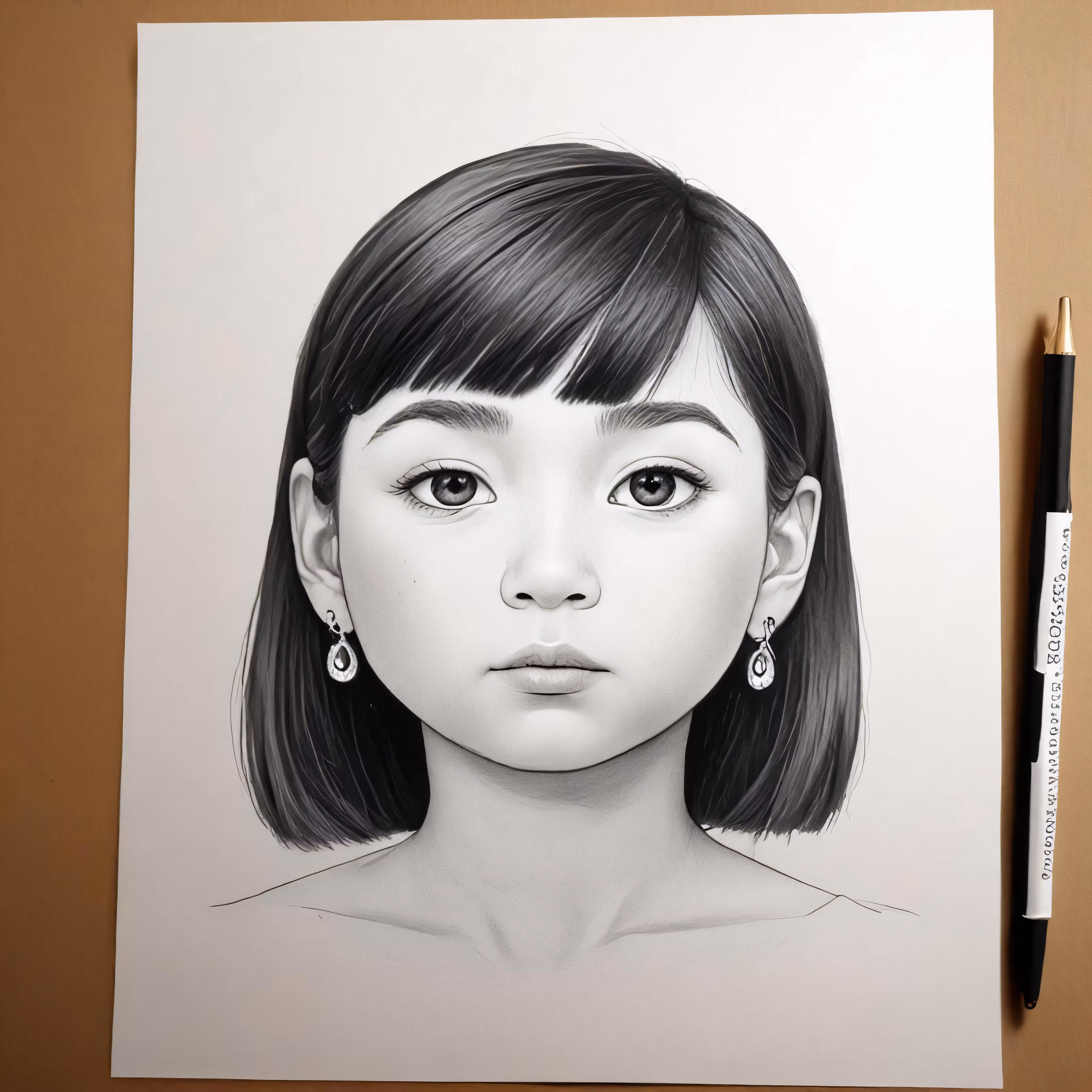 High resolution picture, free to use, a girl is shown in black and white with a pencil