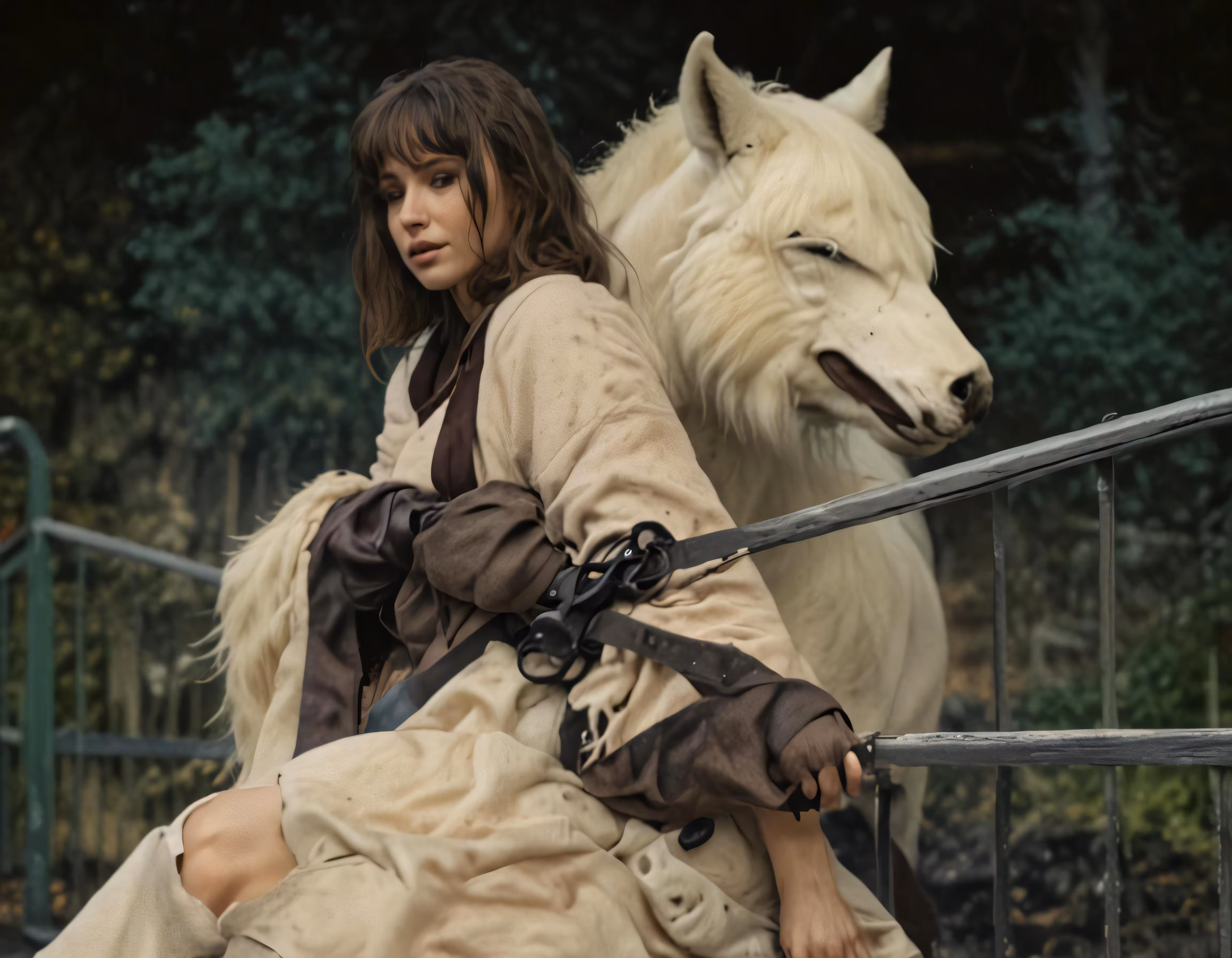 High resolution picture, free to use, a girl is sitting down on a railing with a white horse