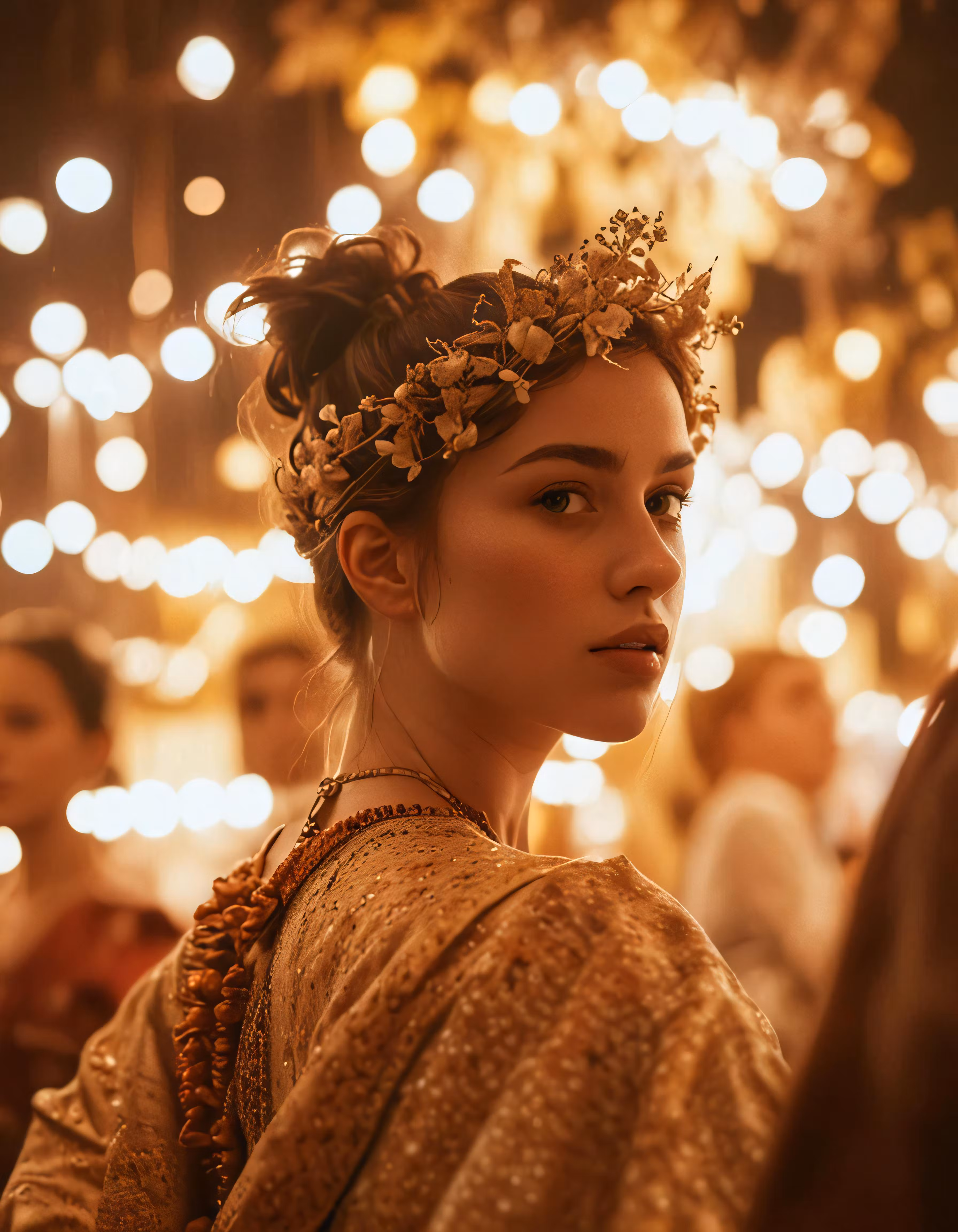 High resolution picture, free to use, a girl is wearing a floral headband and looking off into the distance