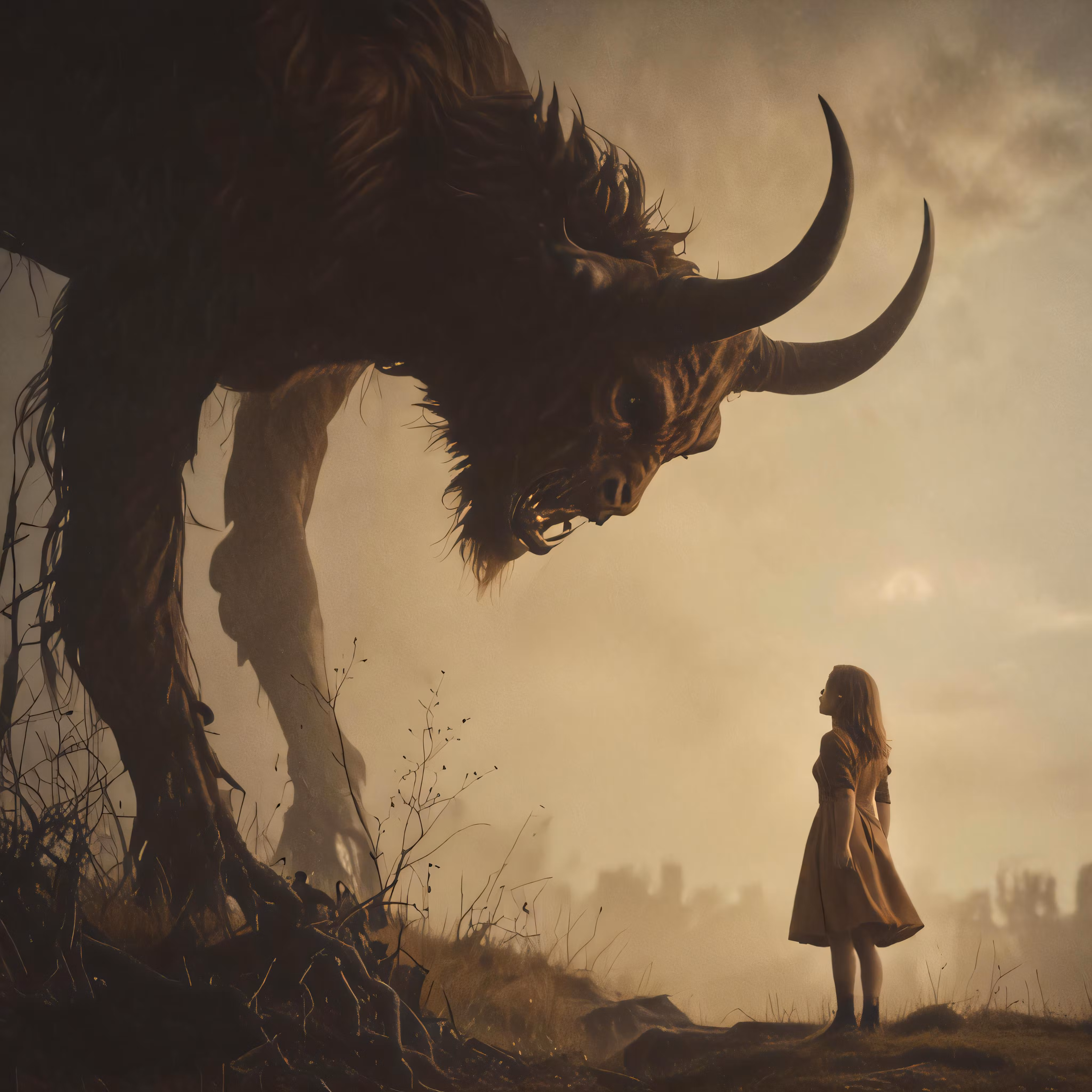 High resolution picture, free to use, a girl looking at a horned animal, that looks like a monster