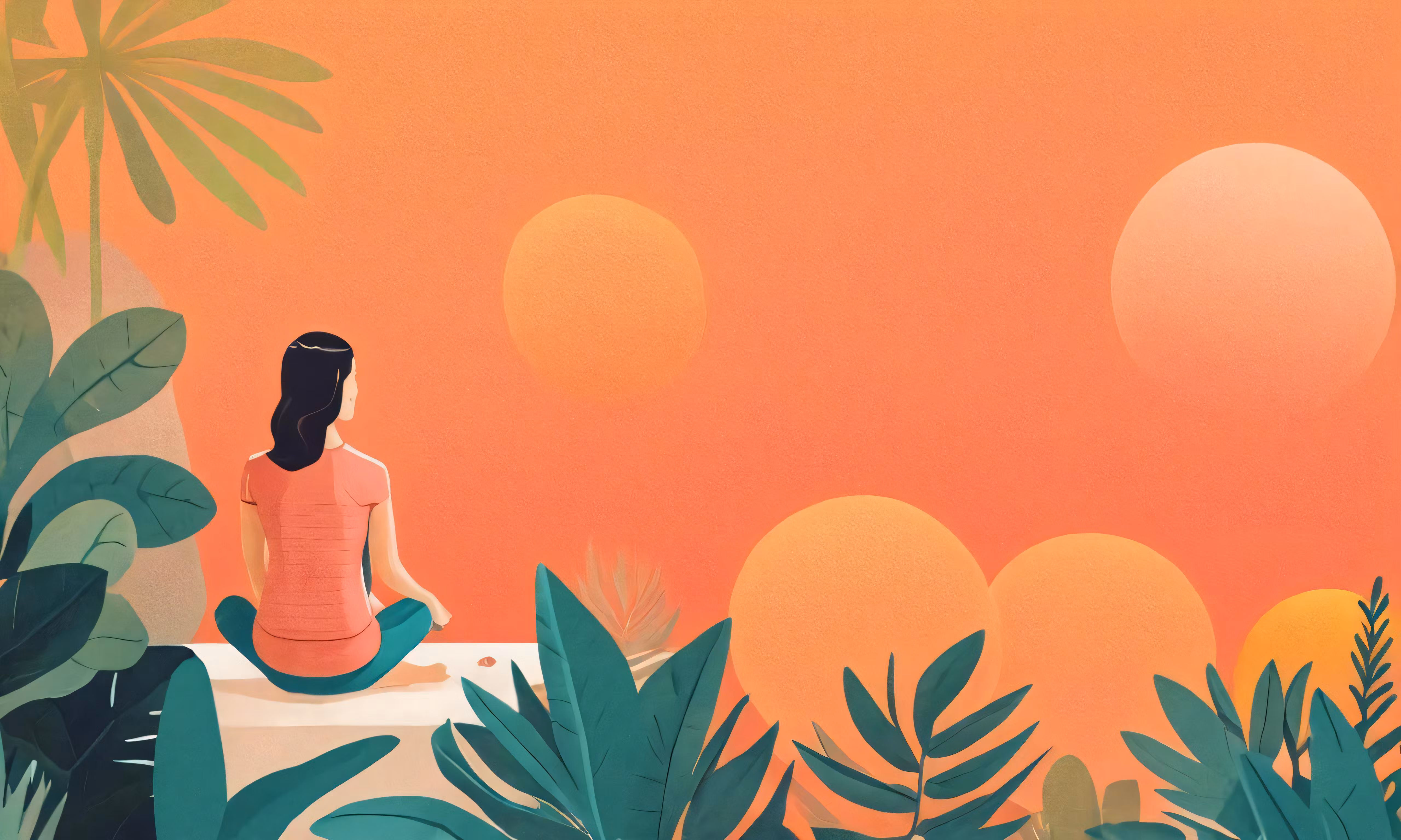 High resolution picture, free to use, a girl meditating in the middle of an open, colorful tropical jungle