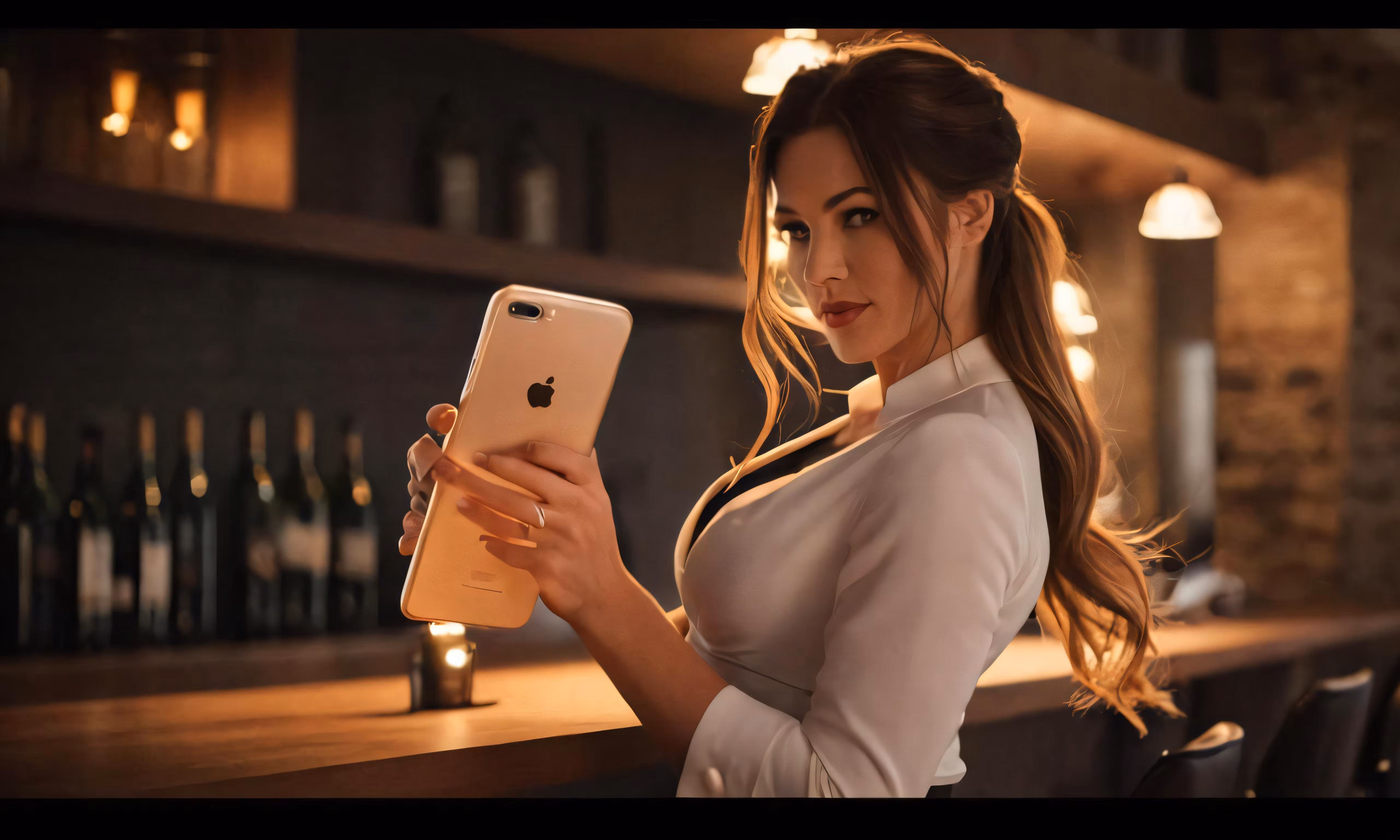 High resolution picture, free to use, a girl poses with an iphone near some empty bottles