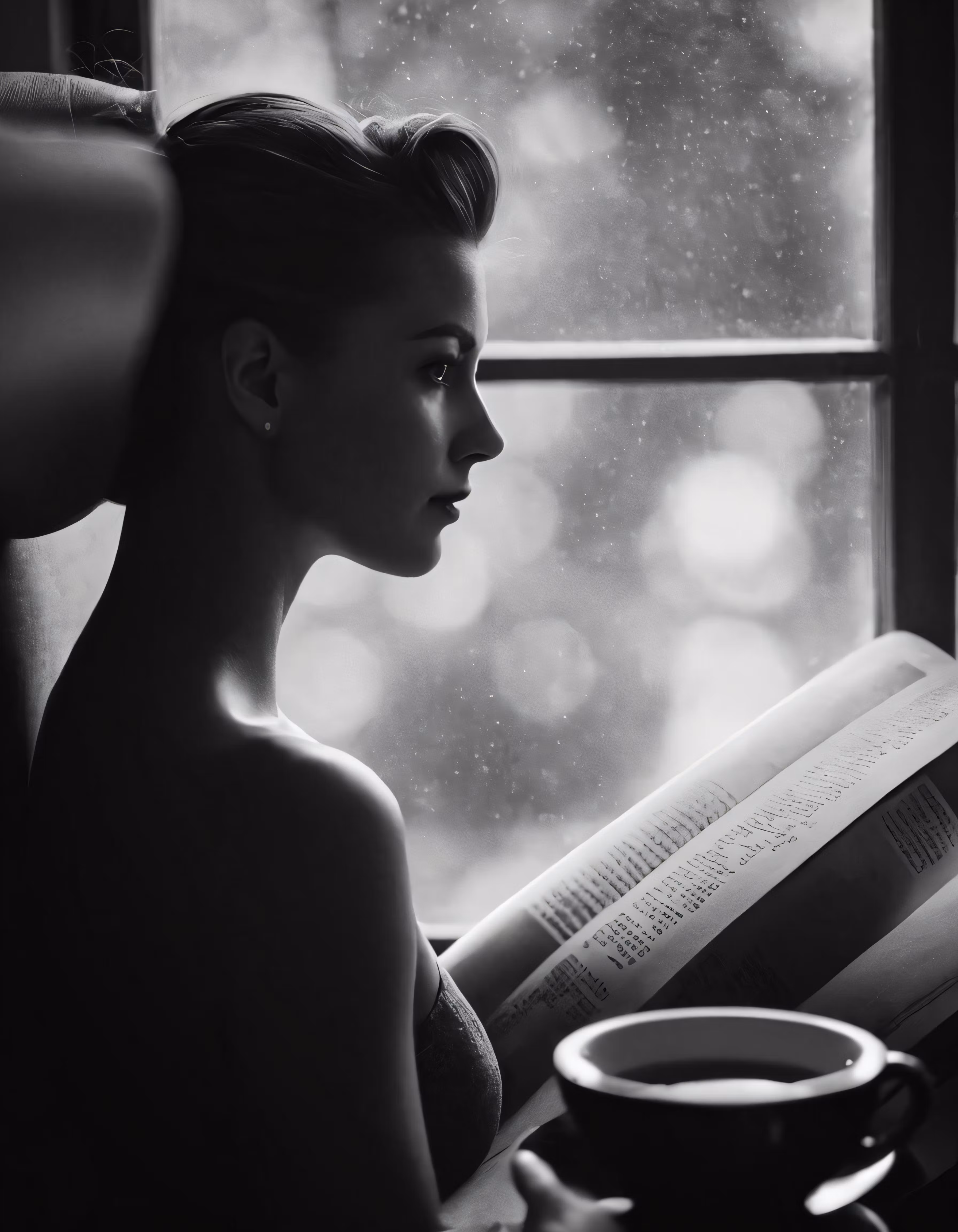 High resolution picture, free to use, a girl reads a book while holding a cup of coffee
