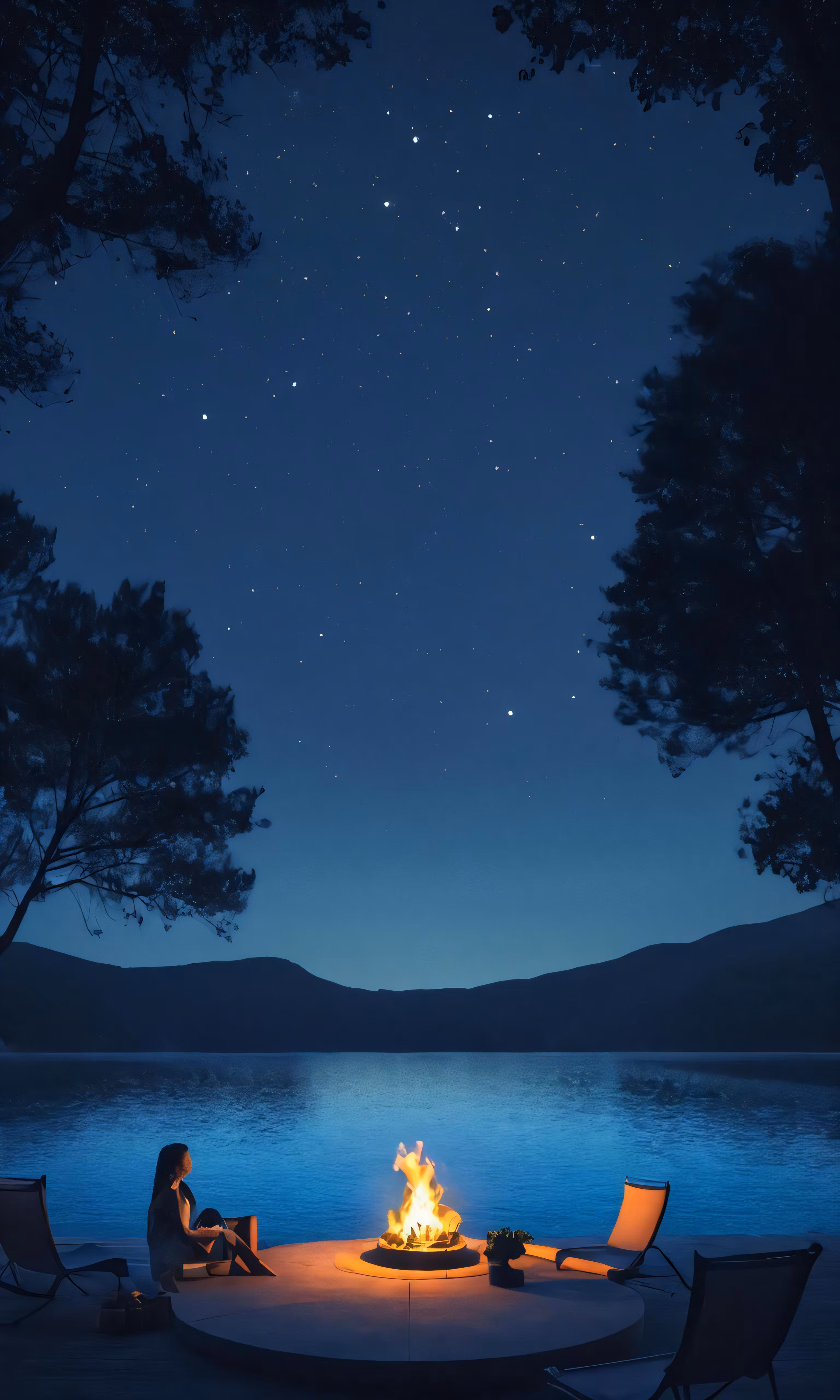 High resolution picture, free to use, a girl sitting on a chair in front of a fire pit