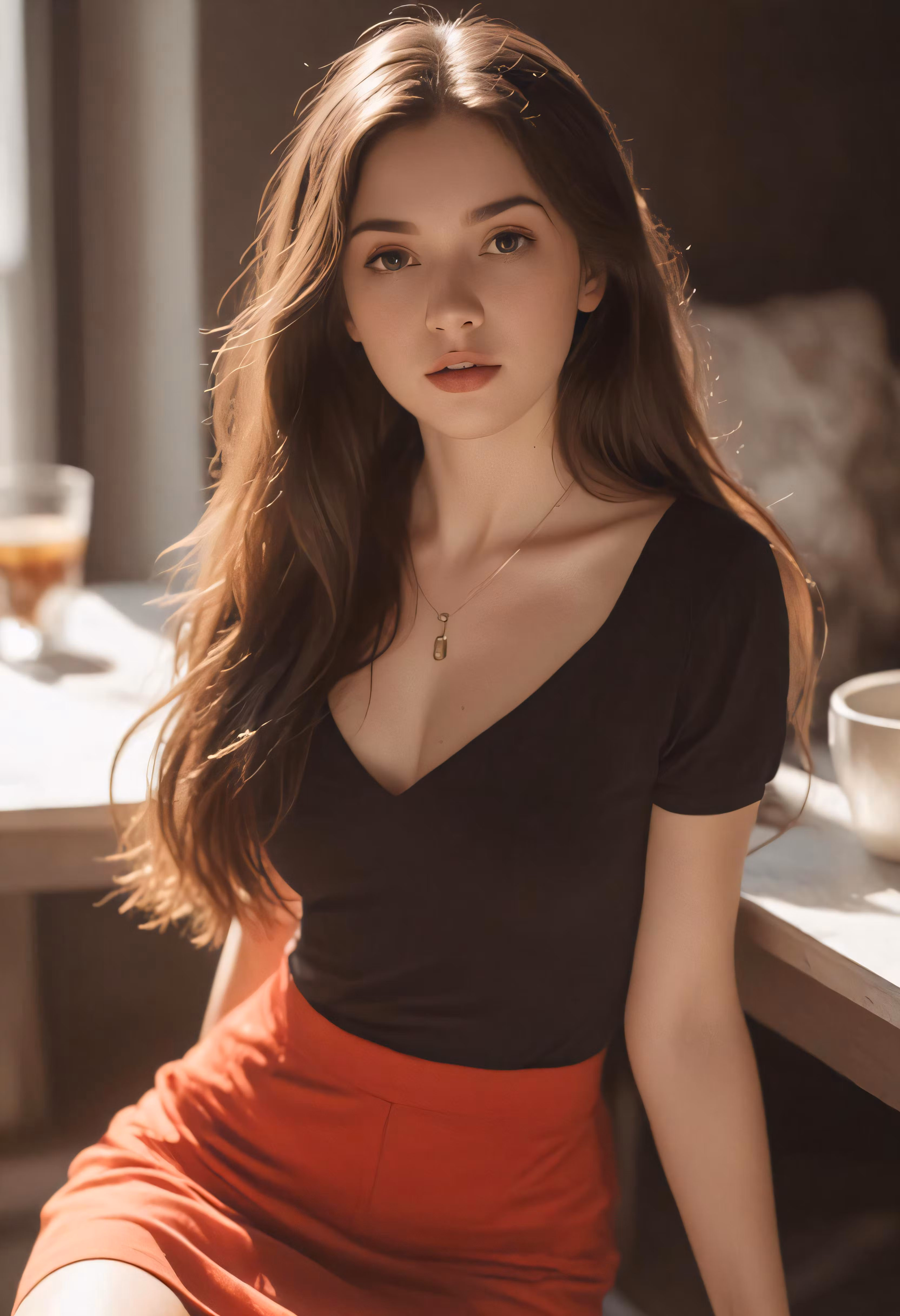 High resolution picture, free to use, a girl sitting on a table with a cup