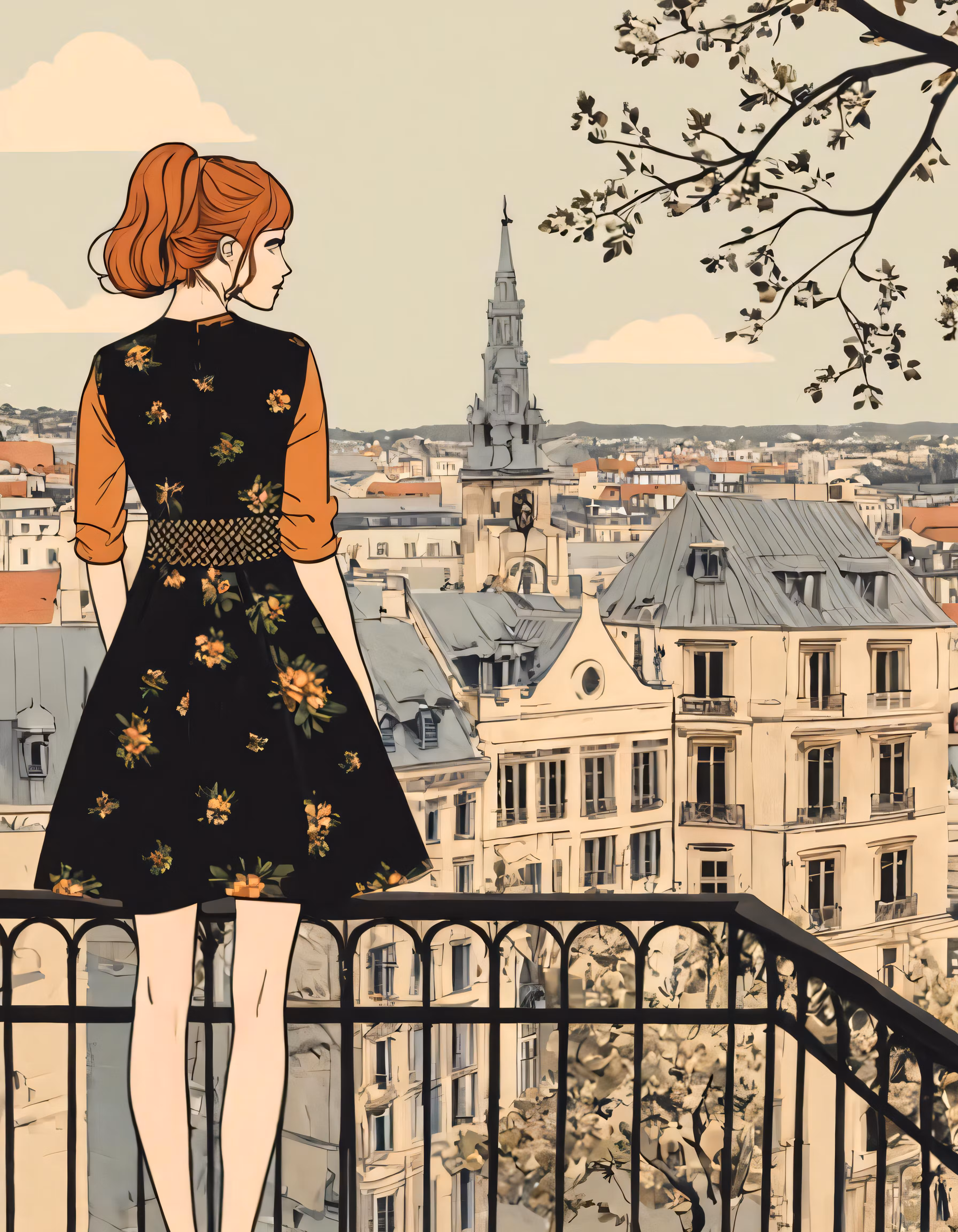 High resolution picture, free to use, a girl stands on a balcony with a cityscape in the background