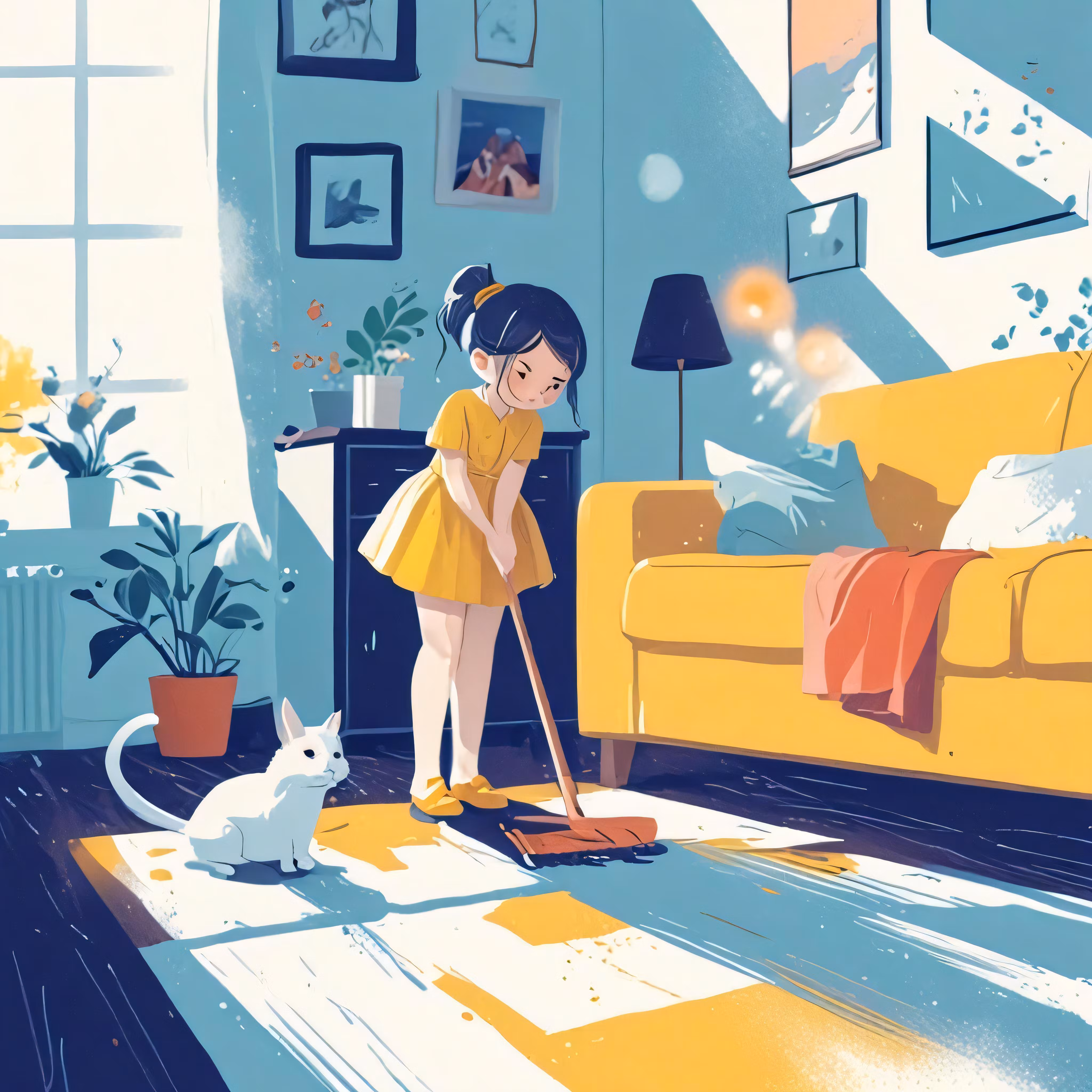High resolution picture, free to use, a girl sweeping up a floor in the living room