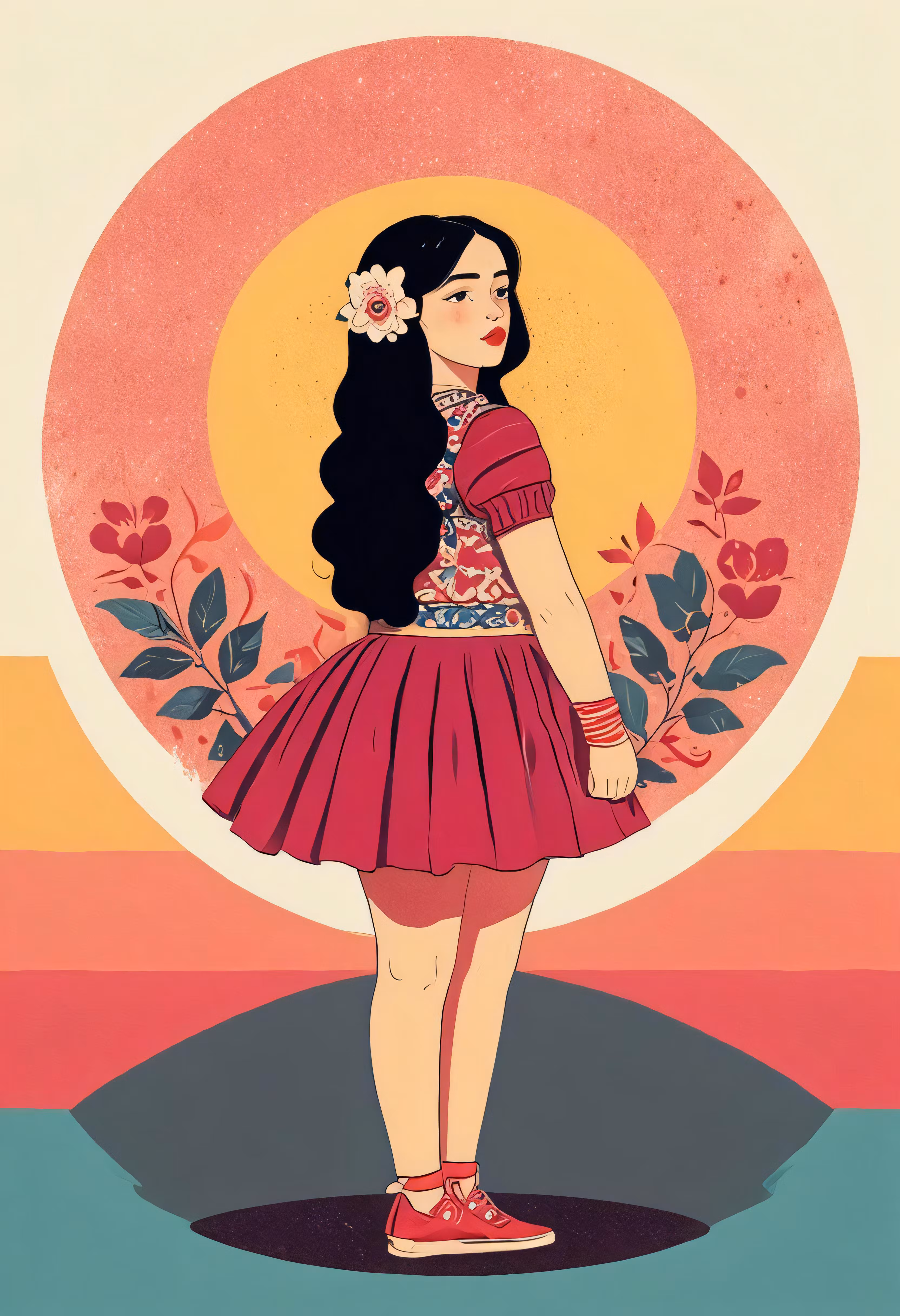 High resolution picture, free to use, a girl wearing a red dress standing next to a round yellow circle
