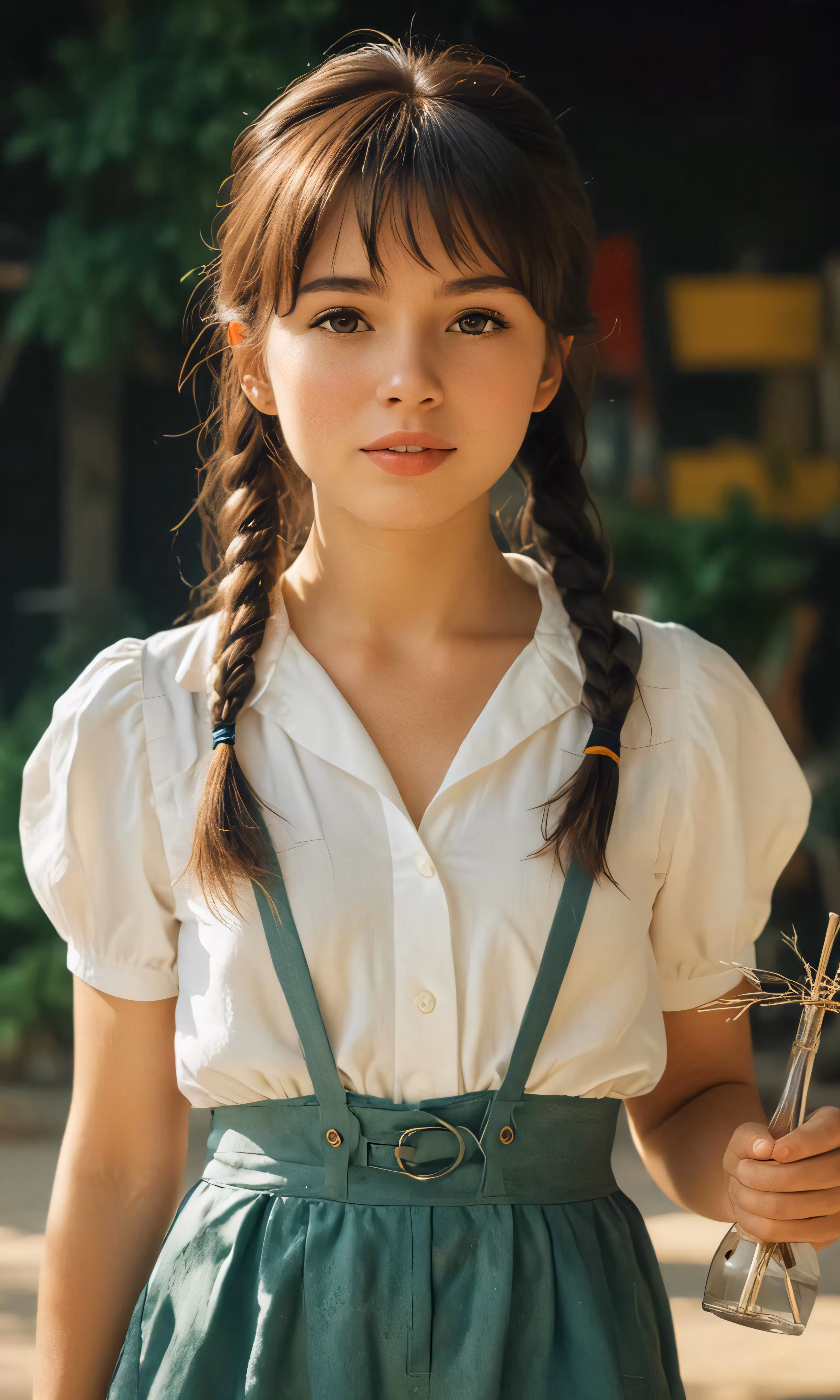 High resolution picture, free to use, a girl wearing green overalls and holding an old cross