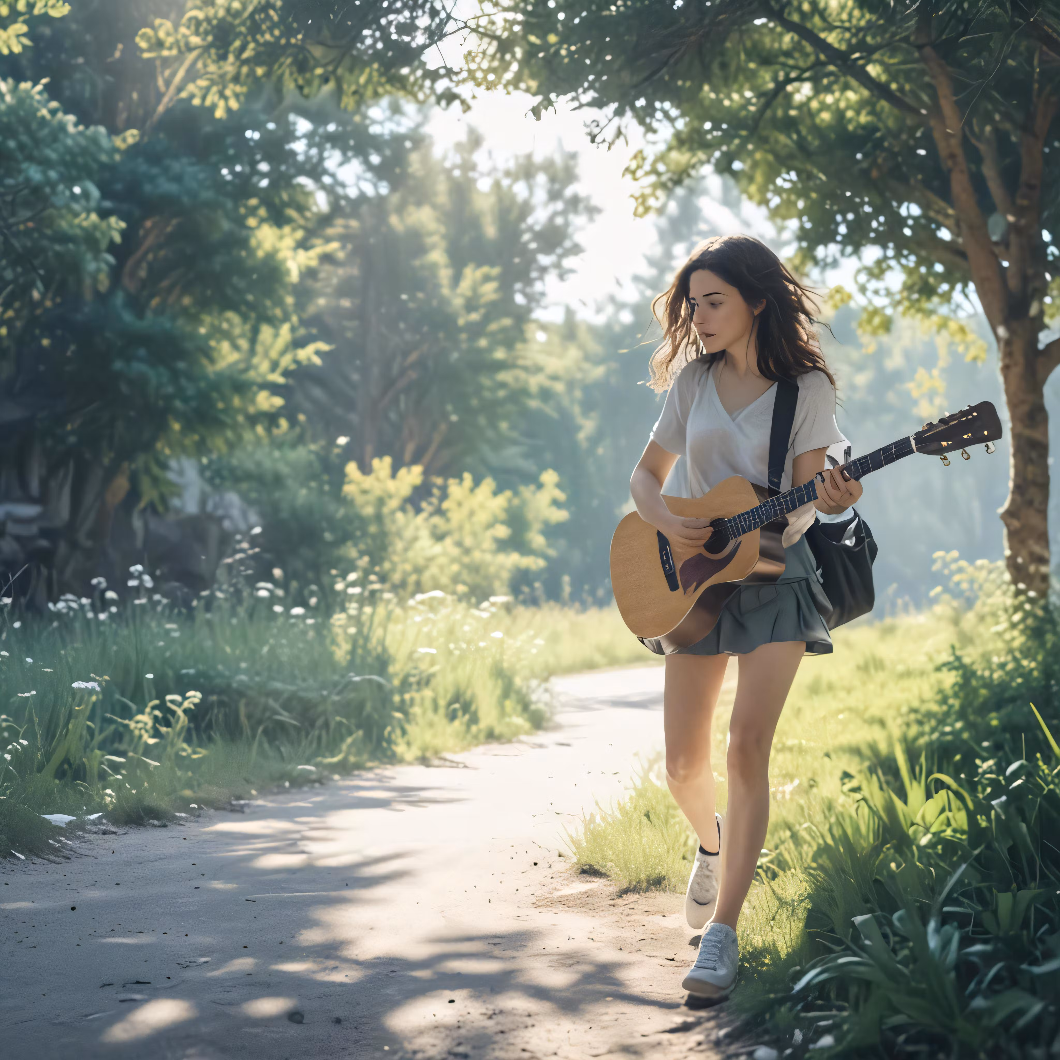 High resolution picture, free to use, a girl with a guitar walking down a road