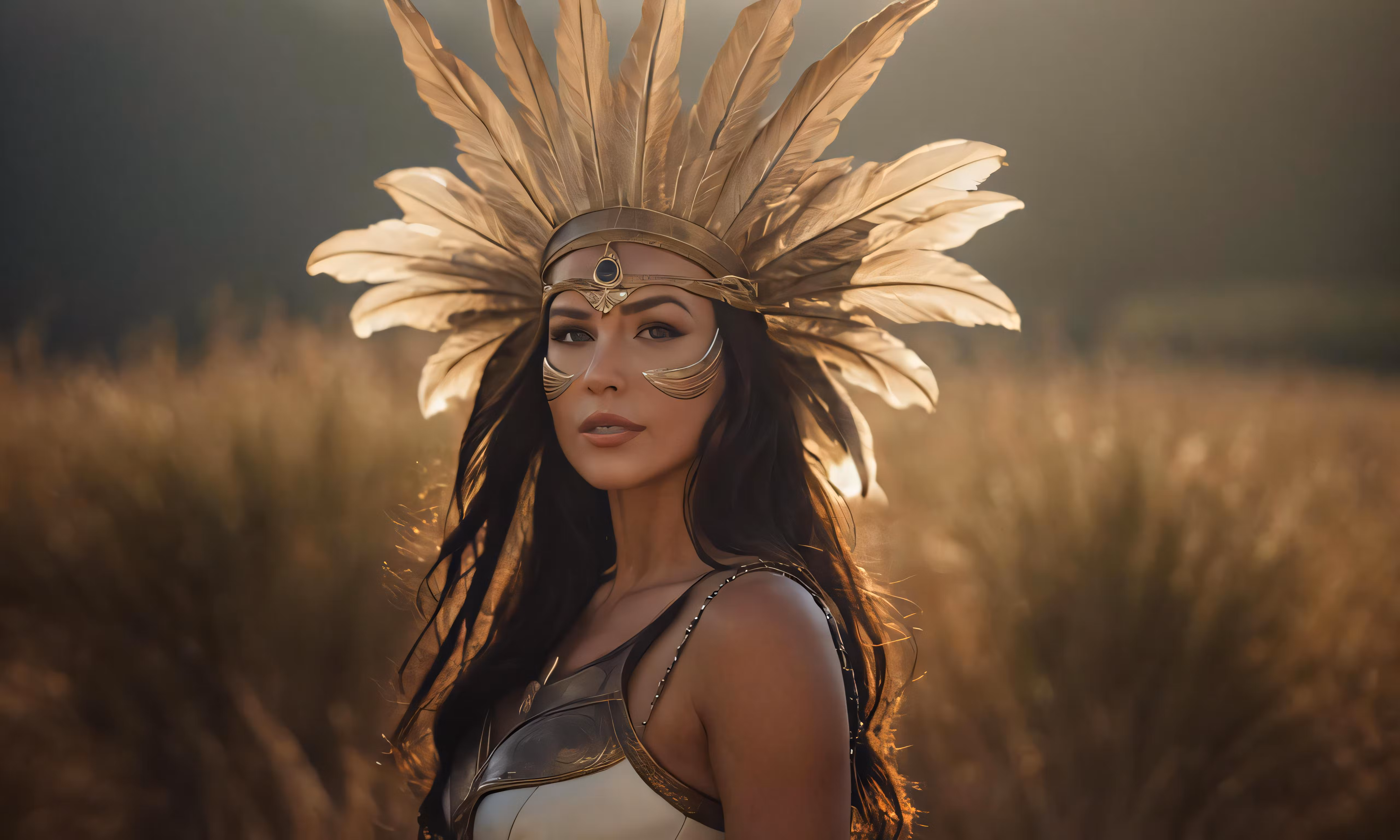 High resolution picture, free to use, a girl with a head dress and feathers stands in the middle of a field