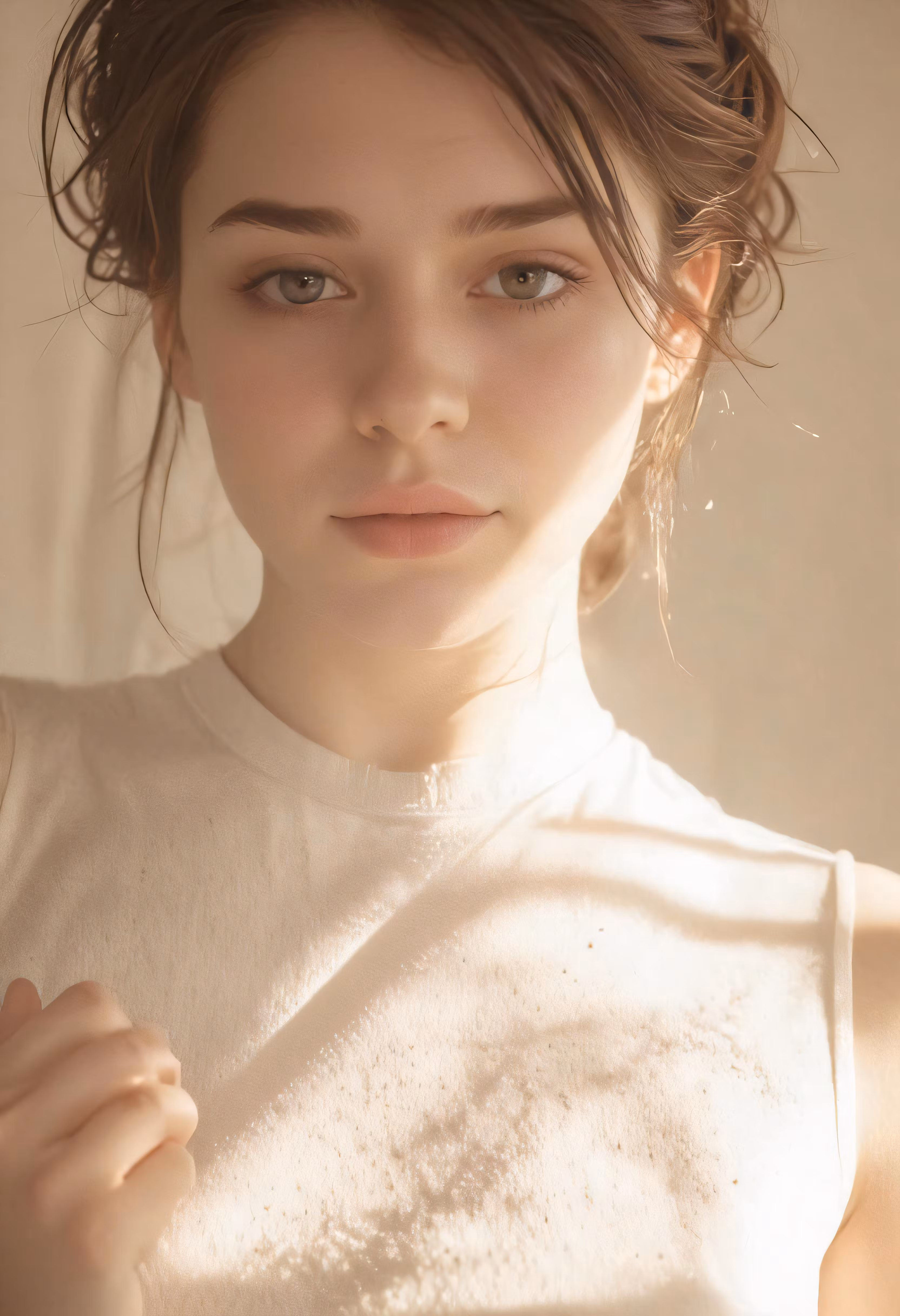 High resolution picture, free to use, a girl with an open shirt looks into the camera