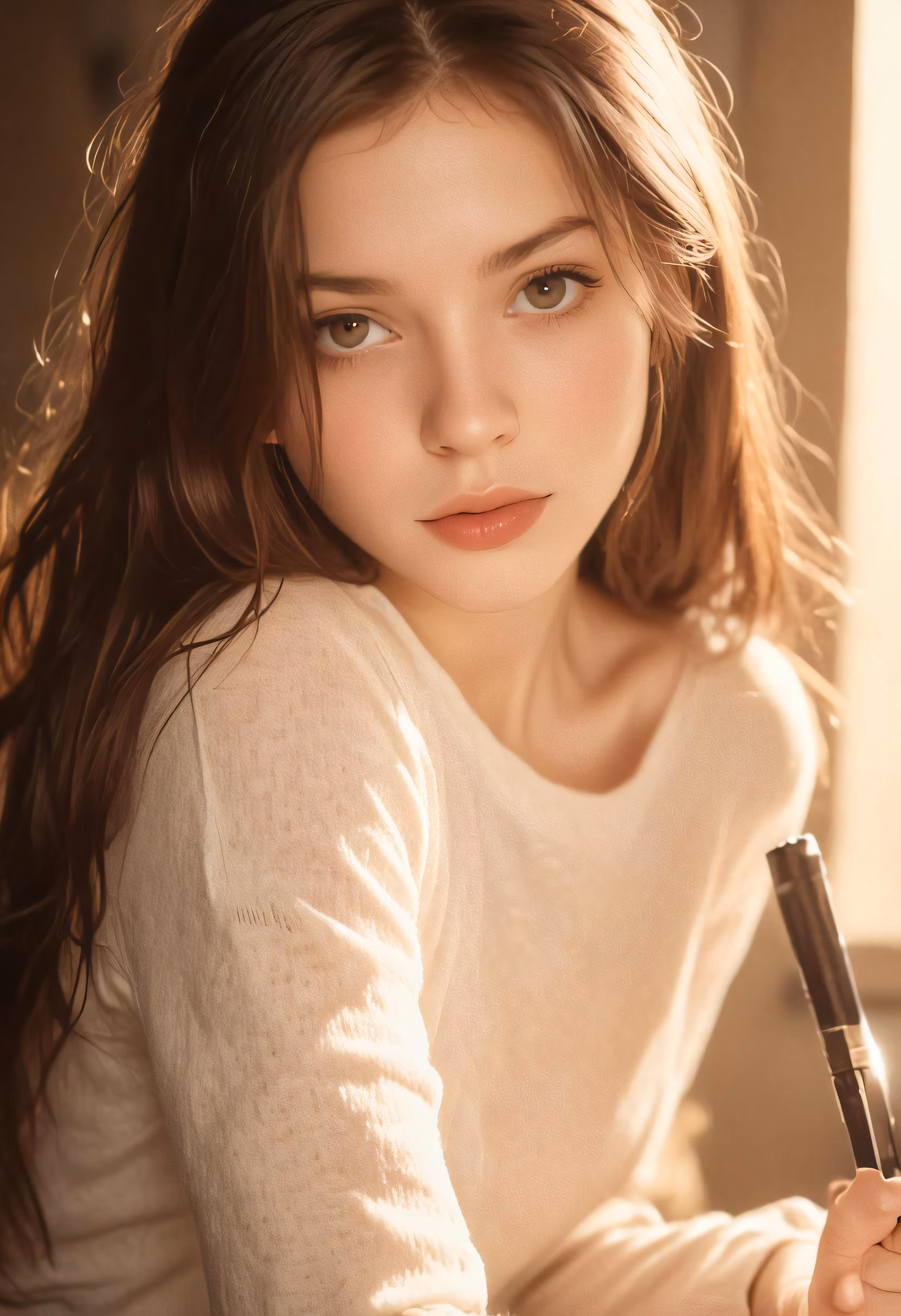 High resolution picture, free to use, a girl with brown hair and wearing a sweater sitting on a window sill holding a pen