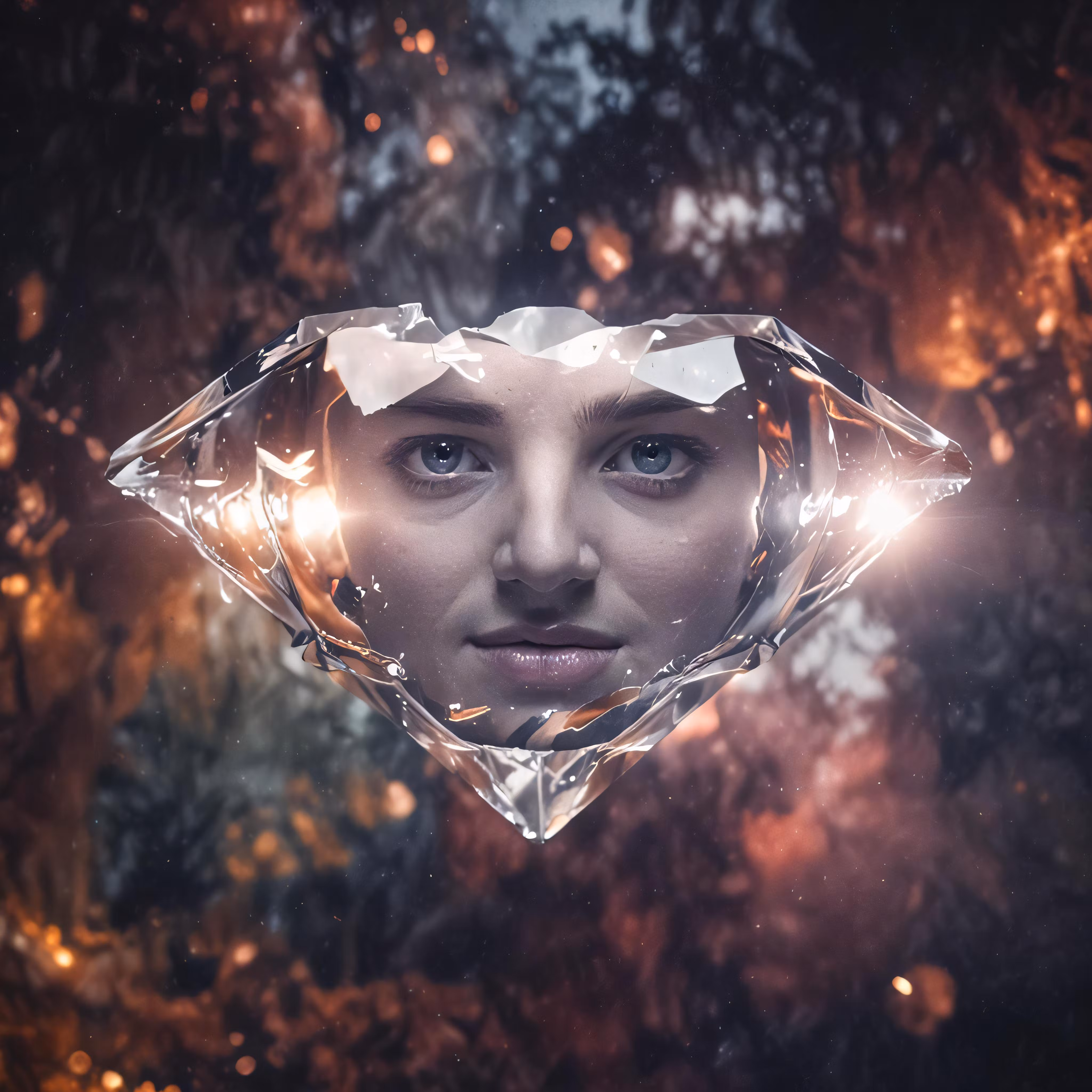 High resolution picture, free to use, a girl with dark eyes has her face reflected in the clear crystal diamond