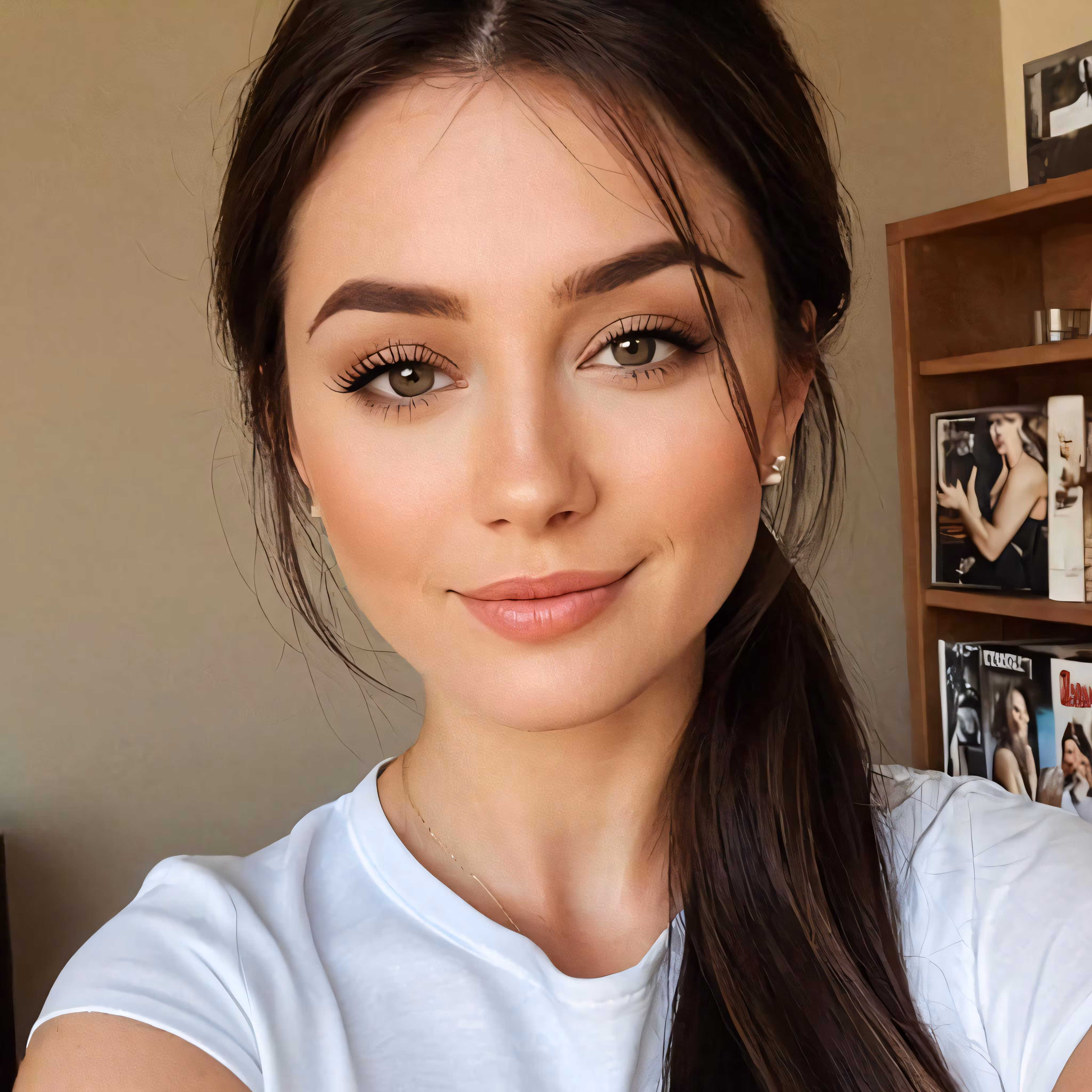 High resolution picture, free to use, a girl with dark hair smiling in front of some photos