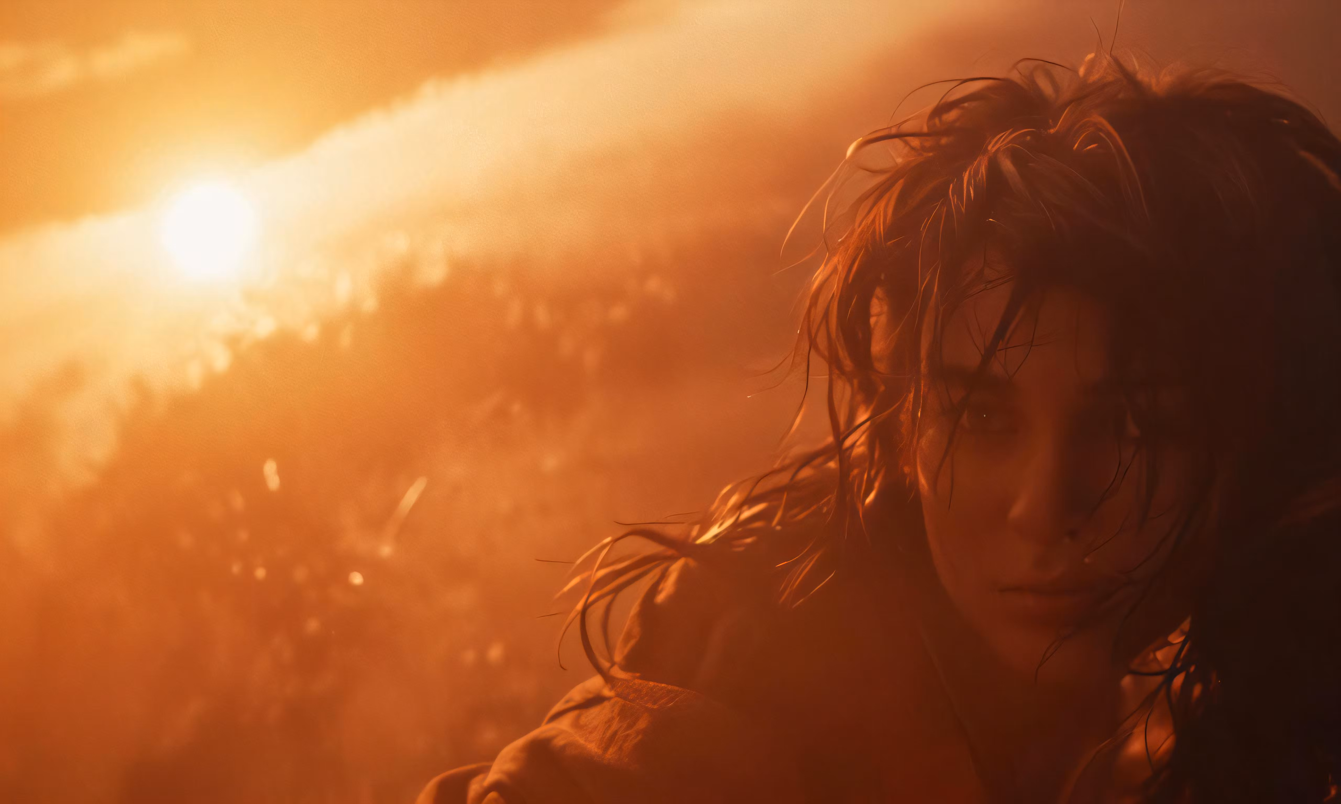 High resolution picture, free to use, a girl with flowing hair in front of an orange sunset