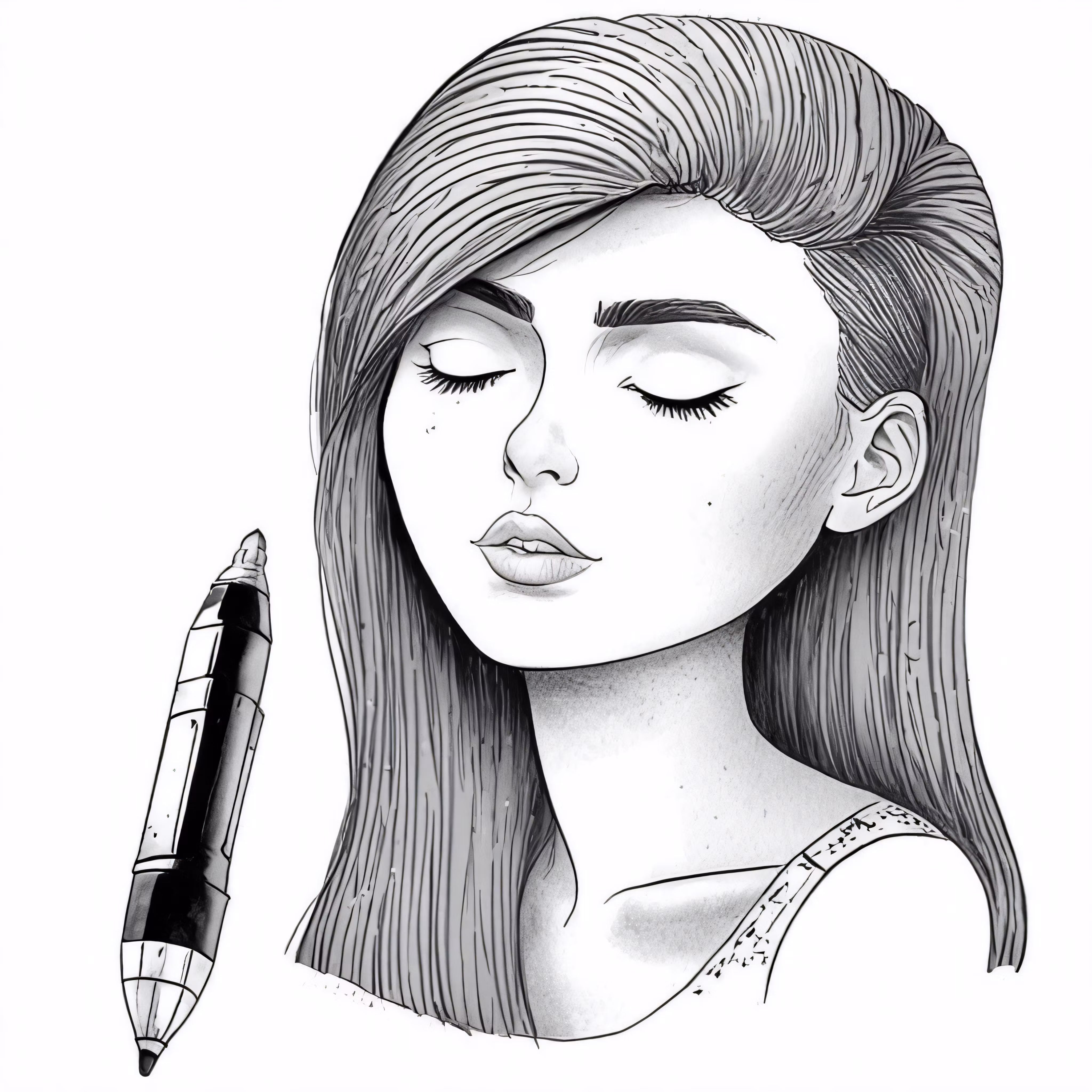 High resolution picture, free to use, a girl with her eyes closed has a pen in front of her