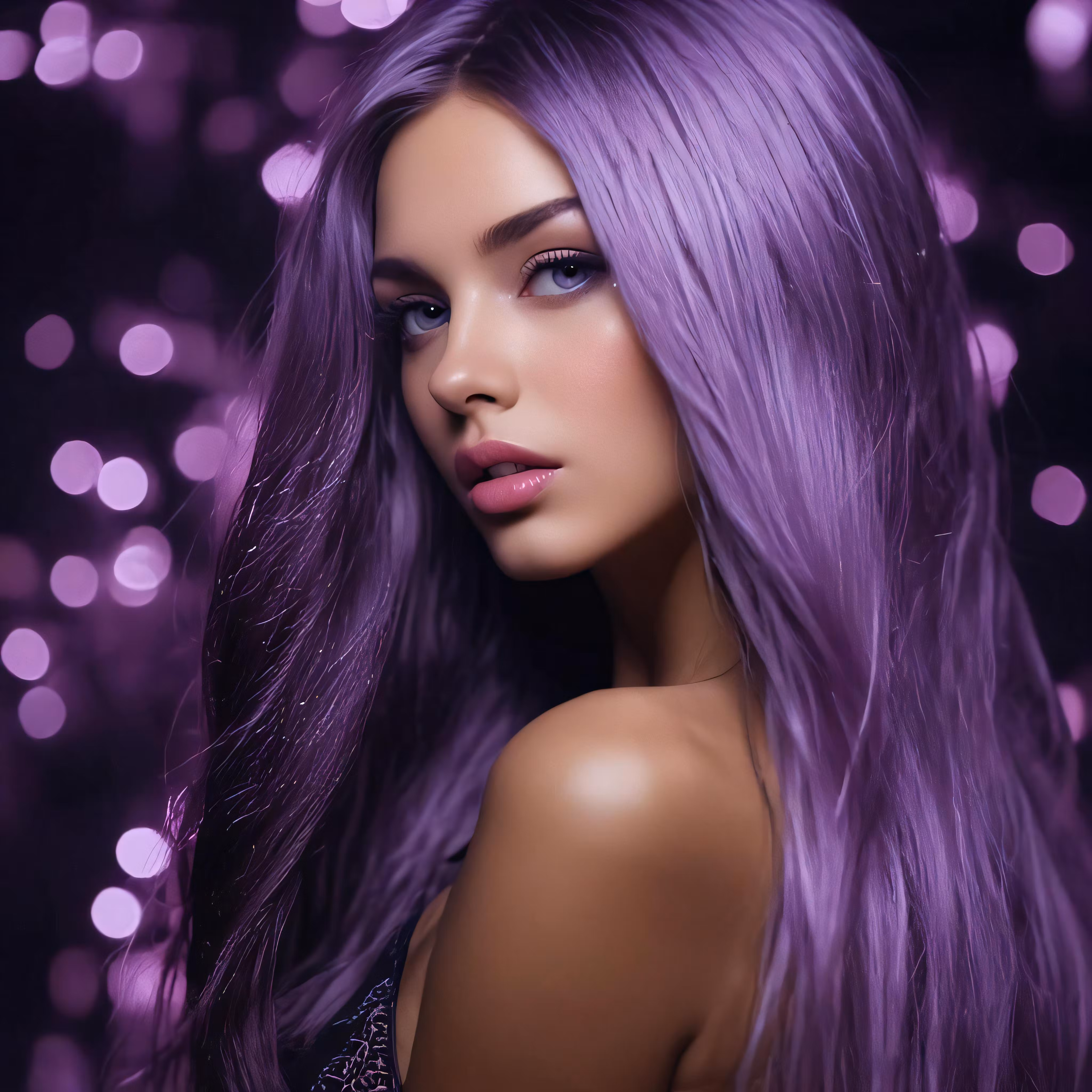 High resolution picture, free to use, a girl with long purple hair and bright pink makeup