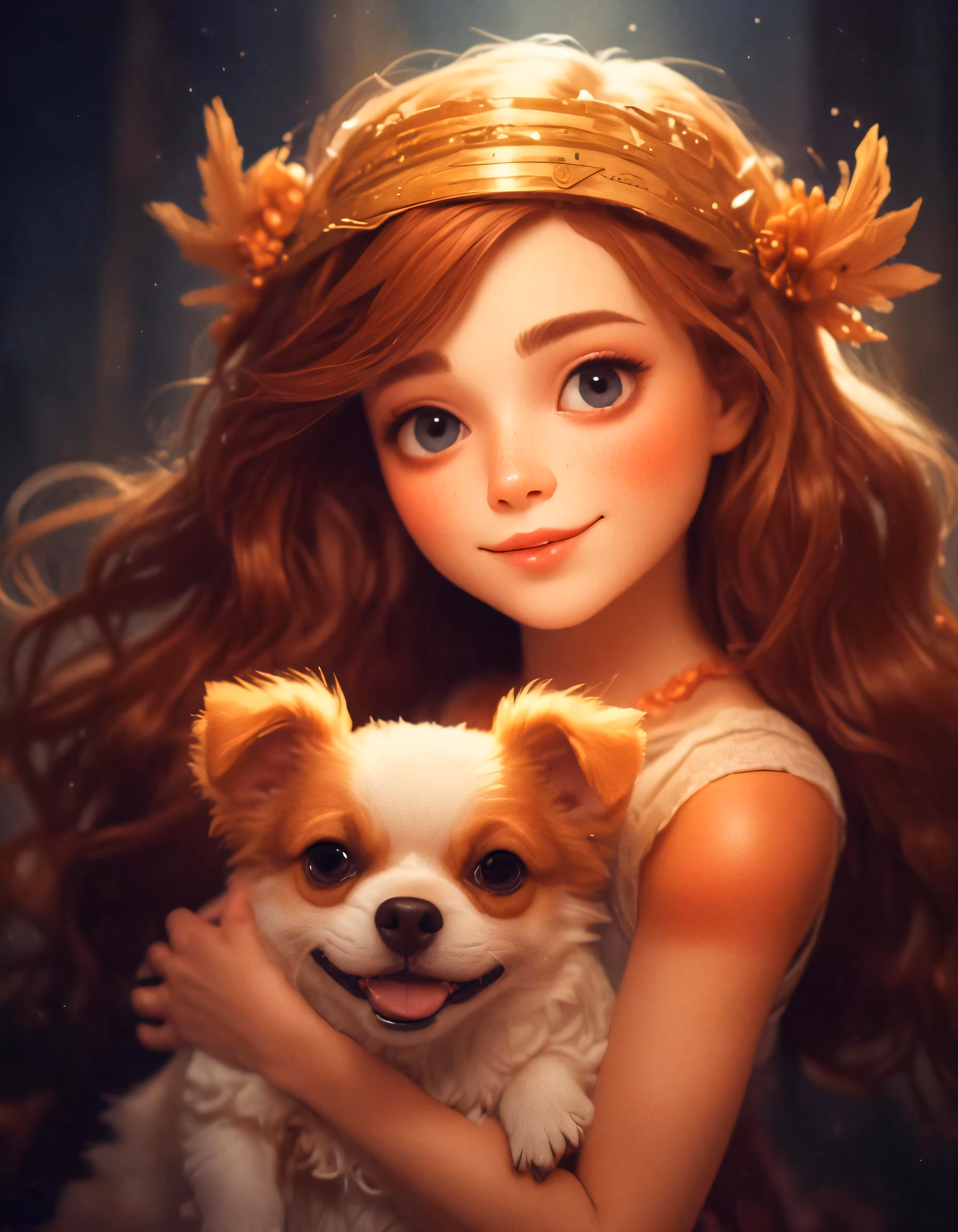 High resolution picture, free to use, a girl with red hair holding a small white dog