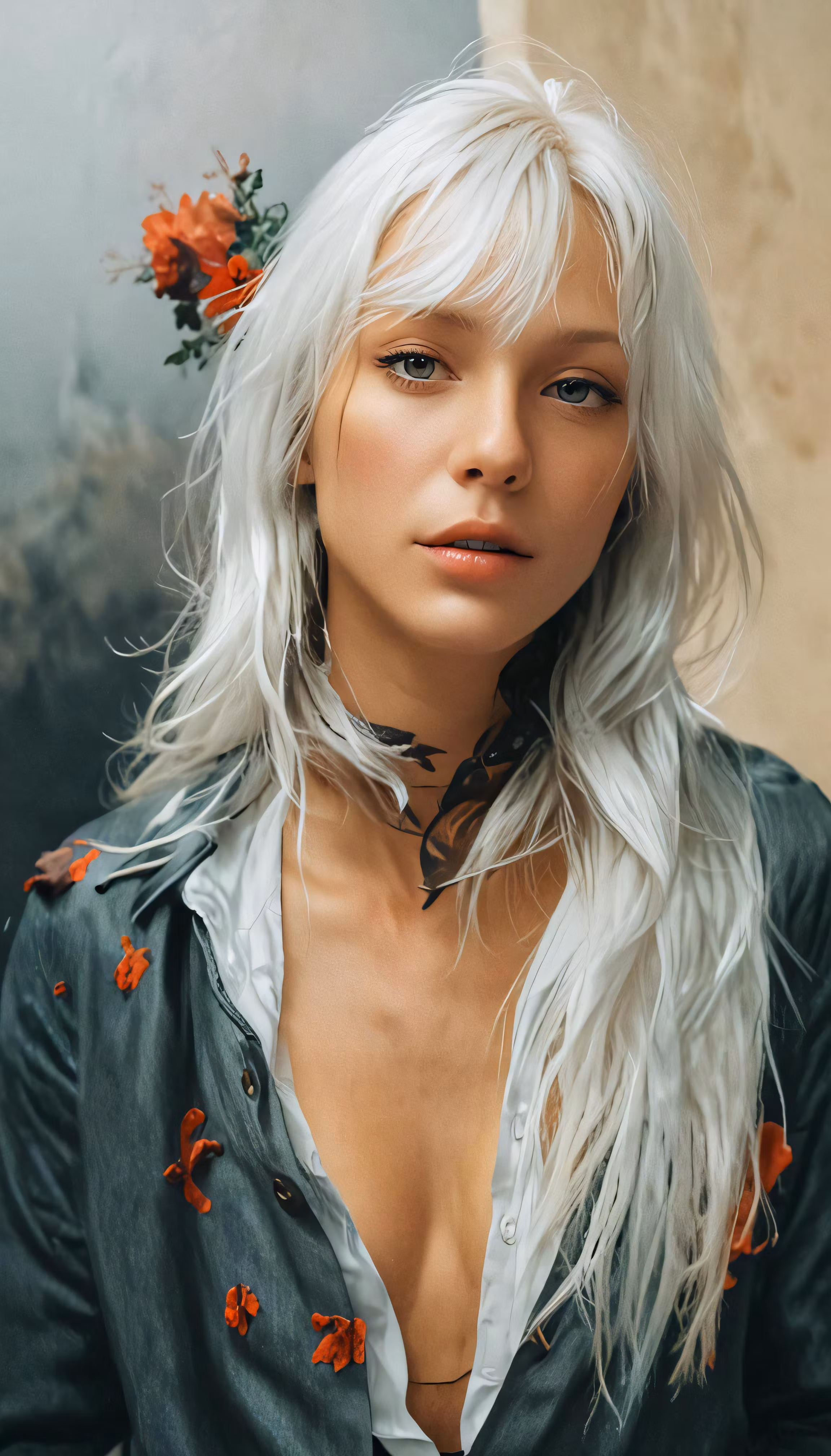 High resolution picture, free to use, a girl with white hair and flowers in her hair