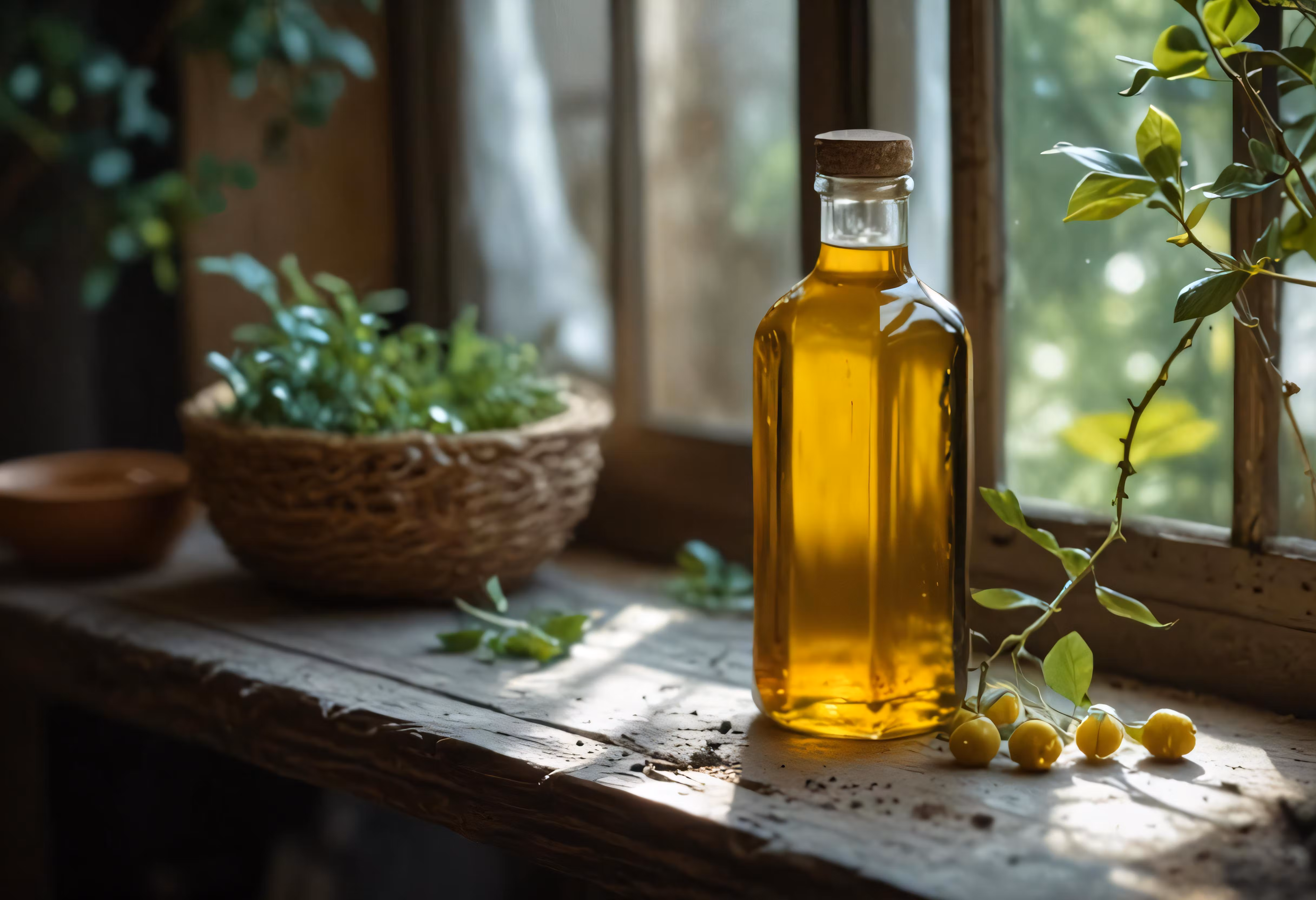 High resolution picture, free to use, a glass bottle of olive oil sitting next to a small plant