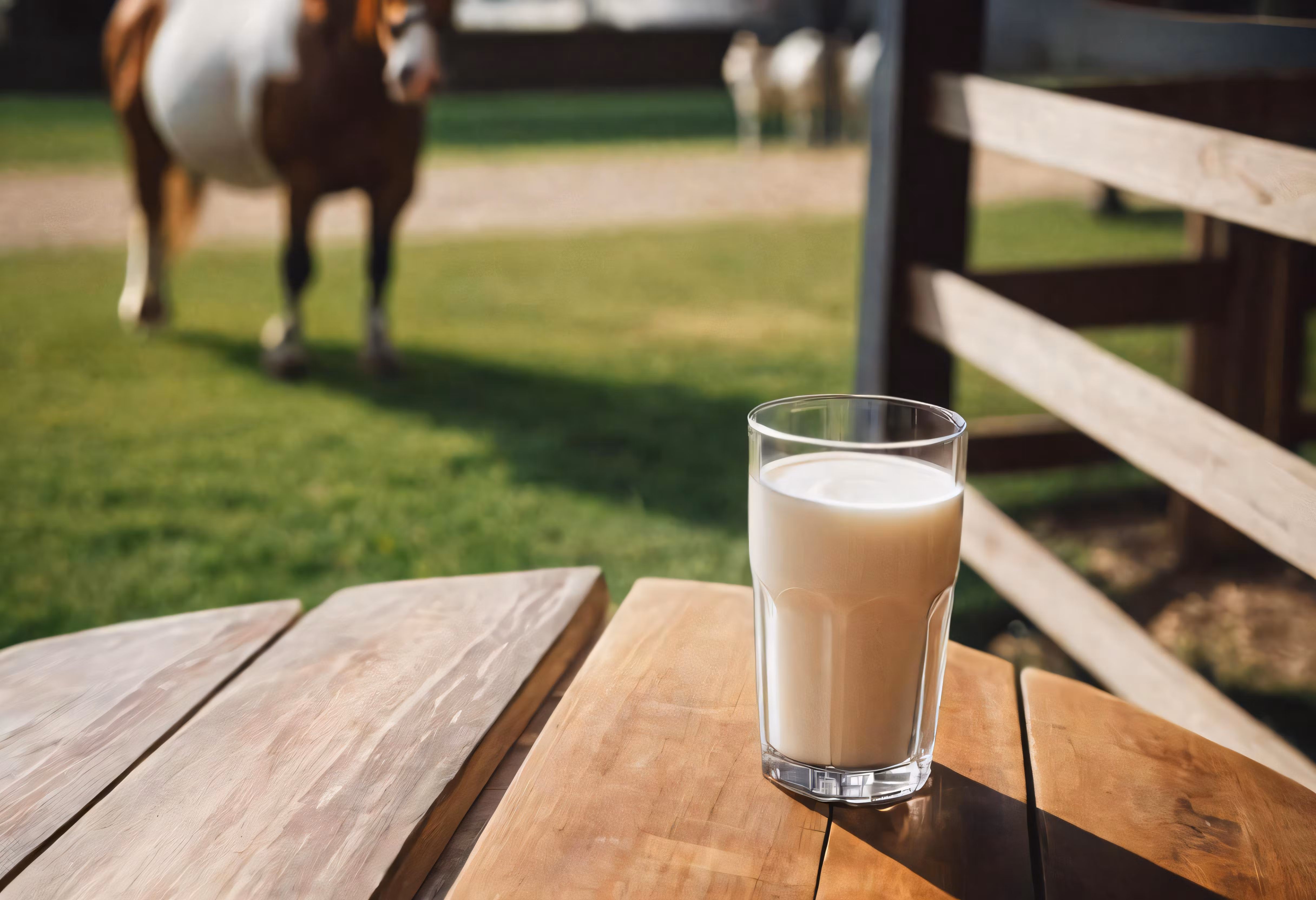 High resolution picture, free to use, a glass of milk sits on a wooden table outside