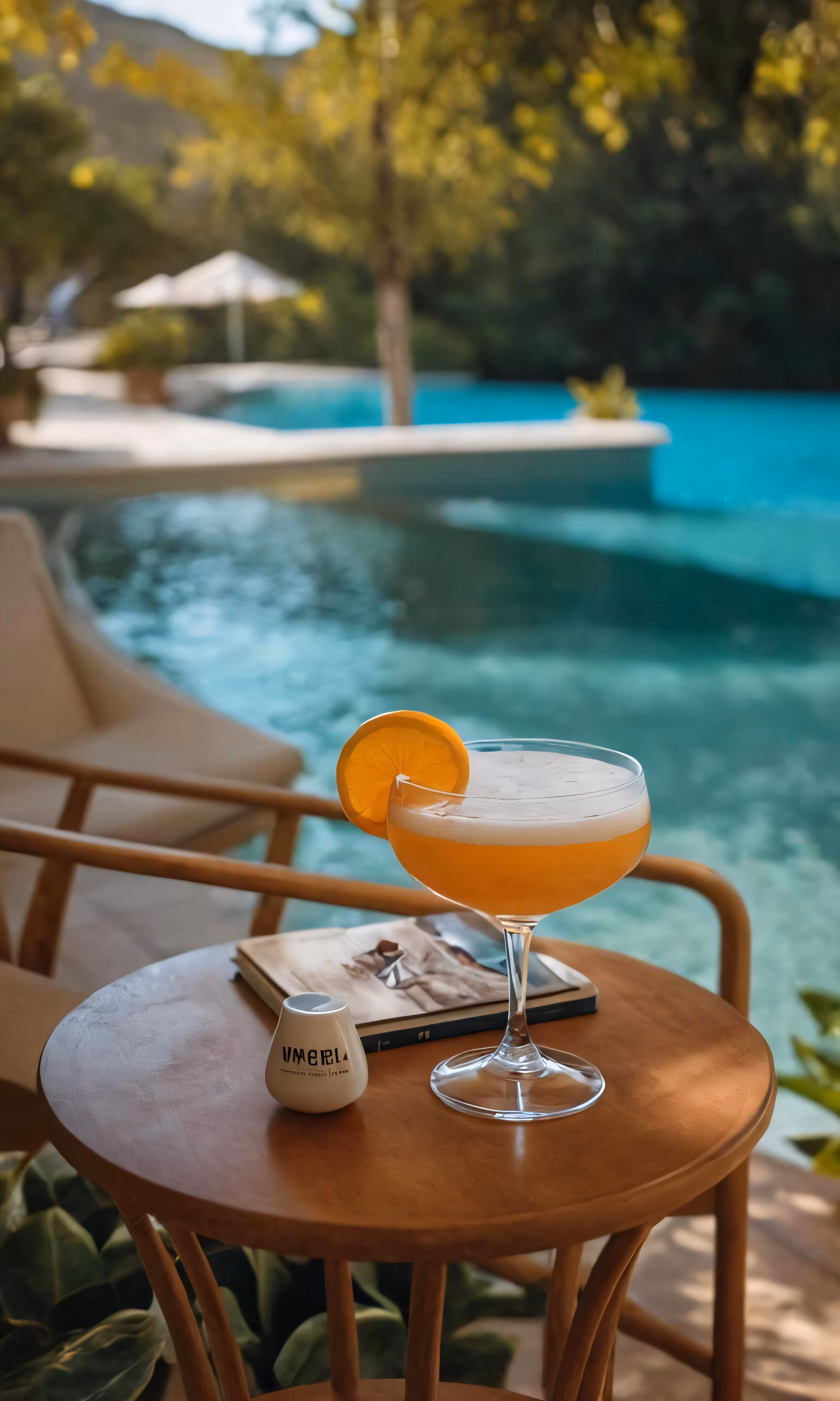 High resolution picture, free to use, a glass of wine next to an empty book on a table near a pool